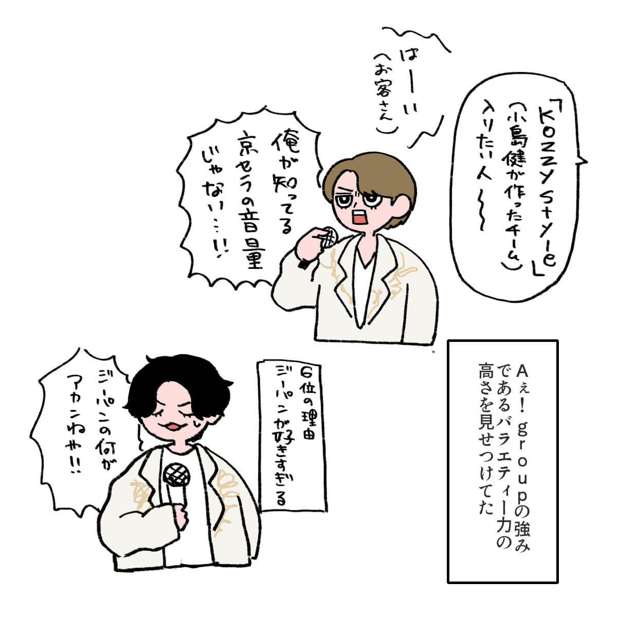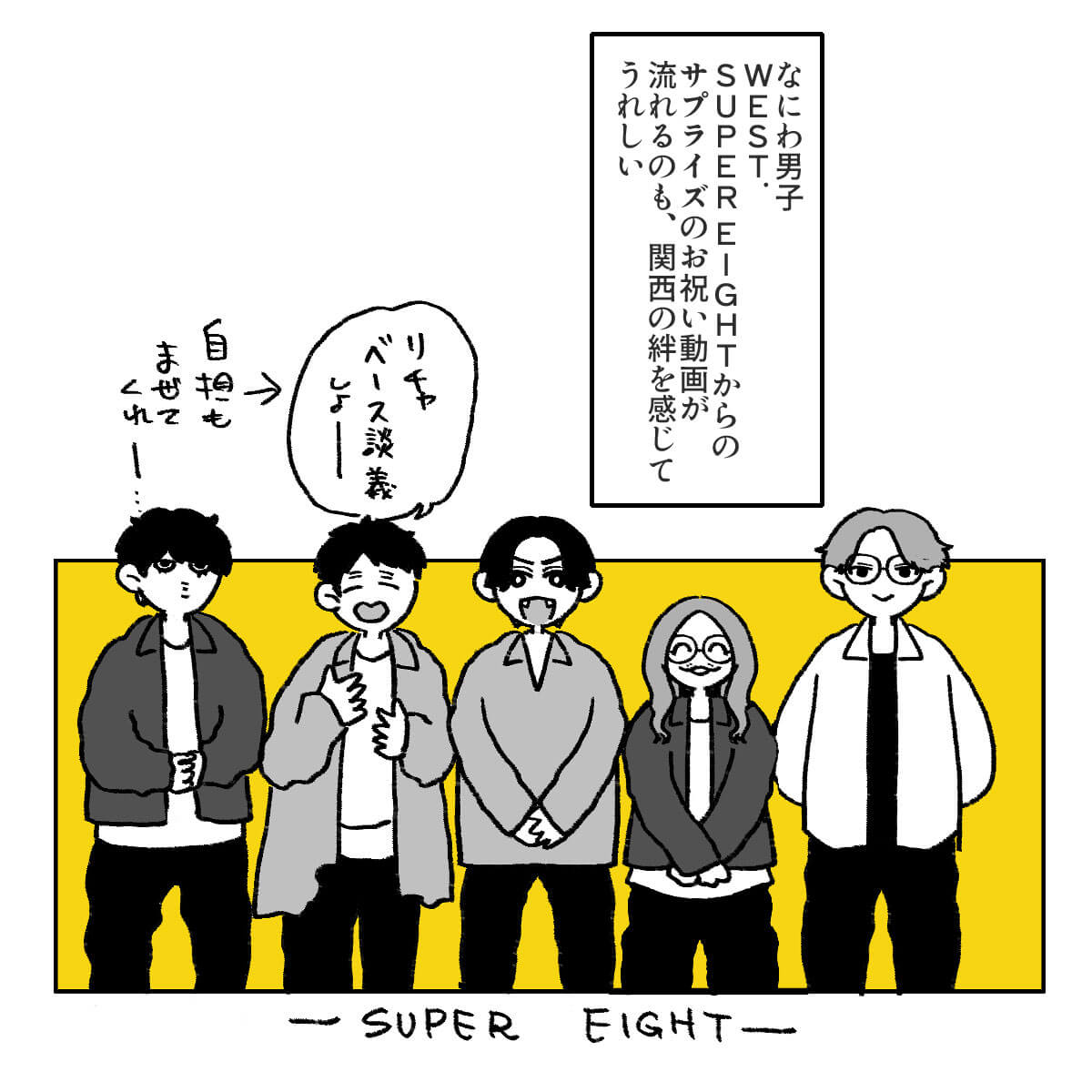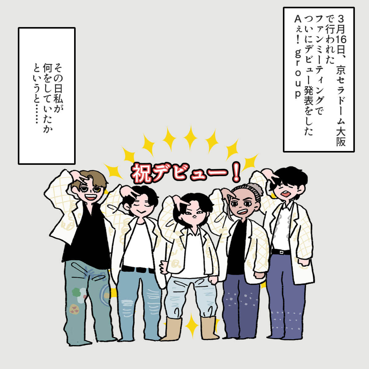 サイゾーウーマン男性アイドルSTARTO(旧ジャニーズ)Aぇ! groupAぇファンミのイラストレポ 男性アイドル [ドルオタ漫画家・竜田トキヒロの“推し事”見聞録]vol.49 Aぇ! group『Aッ倒的ファン大感謝祭』イラストレポ、関西ジュニアはまるで“大家族”! 2024/03/27 21:00 竜田トキヒロ(マンガ家) Aぇ! group竜田トキヒロの“推し事”見聞録ジュニア ――Twitterで日々、STARTO ENTERTAINMENT(旧ジャニーズ事務所)のタレントをはじめとしたイラストを投稿中のドルオタ漫画家・竜田トキヒロが、現場レポートからドラマや映画、番組レビューまで、“推し事”の様子をお届け! 今回は、3月16、17日に京セラドーム大阪で開催され、16日には「FAMILY CLUB online」で生配信も実施された、関西ジュニア・Aぇ! groupの単独イベント『Aぇ! group Aッ倒的ファン大感謝祭 in 京セラドーム大阪』に注目! デビュー前のジュニアが単独でドームイベントや公演を行うのは、2006年にCDデビュー前のアーティストとして史上初の東京ドーム公演を開催したKAT-TUN以来ということで、何らかの発表があるのではないかと、開催前からファンが期待を寄せていたこのイベント。 その思いに応えるかのごとく、16日の公演中、メンバーの口から5月15日に「《A》BEGINNING」という楽曲で、ユニバーサルミュージックからCDデビューすることが明かされました。 この記事では、そんなメモリアルな公演の様子を、イラストで振り返ります! 目次 ・Aぇ! group、ライブの雰囲気がデビュー組みたい!? ・デビューのお祝い動画で感じた関西の絆 ・“大家族”関西ジュニアの距離の近さ Aぇ! group、ファンミーティングのライブの雰囲気がデビュー組みたい!? なにわ男子にWEST.、SUPER EIGHTも……Aぇ! groupへのデビューのお祝い動画で感じた関西の絆 Aぇ! groupのファンミーティングに見た、“大家族”関西ジュニアの距離の近さ ★これまでの連載記事はこちらから 【ジャニオタマンガ】Aぇ! groupは「高スキル集団」! キャラの濃い6人の個性とは?――Twitterで日々、ジャニーズタレントにまつわるイラストを投稿中のジャニオタ漫画家・竜田トキヒロが、現場レポートからドラマや映画、番組レビューまで、“推し事”の様子を...サイゾーウーマン2023.07.05 竜田トキヒロ(マンガ家) 漫画家、イラストレーター。育休中に執筆したエッセイ漫画でKADOKAWAコミックエッセイ大賞受賞。Ameba、ライブドア公式ブロガーを経たのち現在はインフルエンサーとしてエンタメ、オタクに特化した漫画やイラストや体験ルポ等幅広く執筆。著書『コミュ障母さんとごきげん娘』(KADOKAWA) X:@musumenuma 最終更新:2024/03/27 21:00 関連記事 【ジャニオタマンガ】Aぇ! groupは「高スキル集団」! キャラの濃い6人の個性とは?Aぇ! group『Aッ倒的ファン大感謝祭』レポ――オタクの涙腺が壊れた瞬間とは?ジュニア公式TikTok「いいね」数ランキング、11~20位! Aぇ! groupが伯井太陽を上回る【2024年3月最新】Aぇ! group、福本大晴と“決別”? 配信舞台でのエールに賛否両論西川貴教、Aぇ! group・福本大晴の脱退に言及? ラジオで「全力で応援する」とエール 次の記事 『大奥』が描かない、倫子の幸福だった史実 >