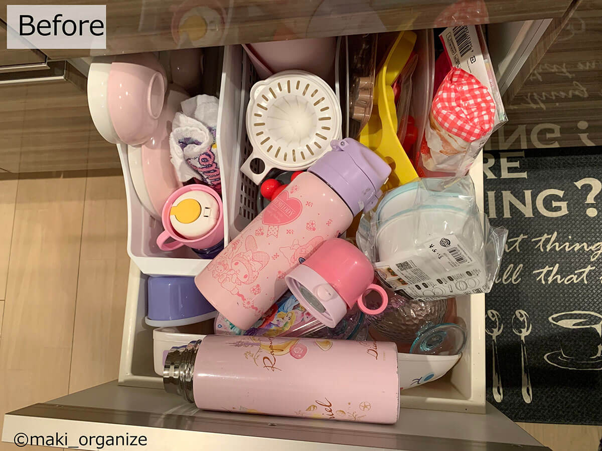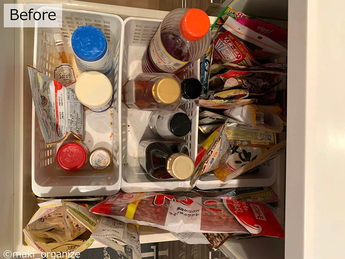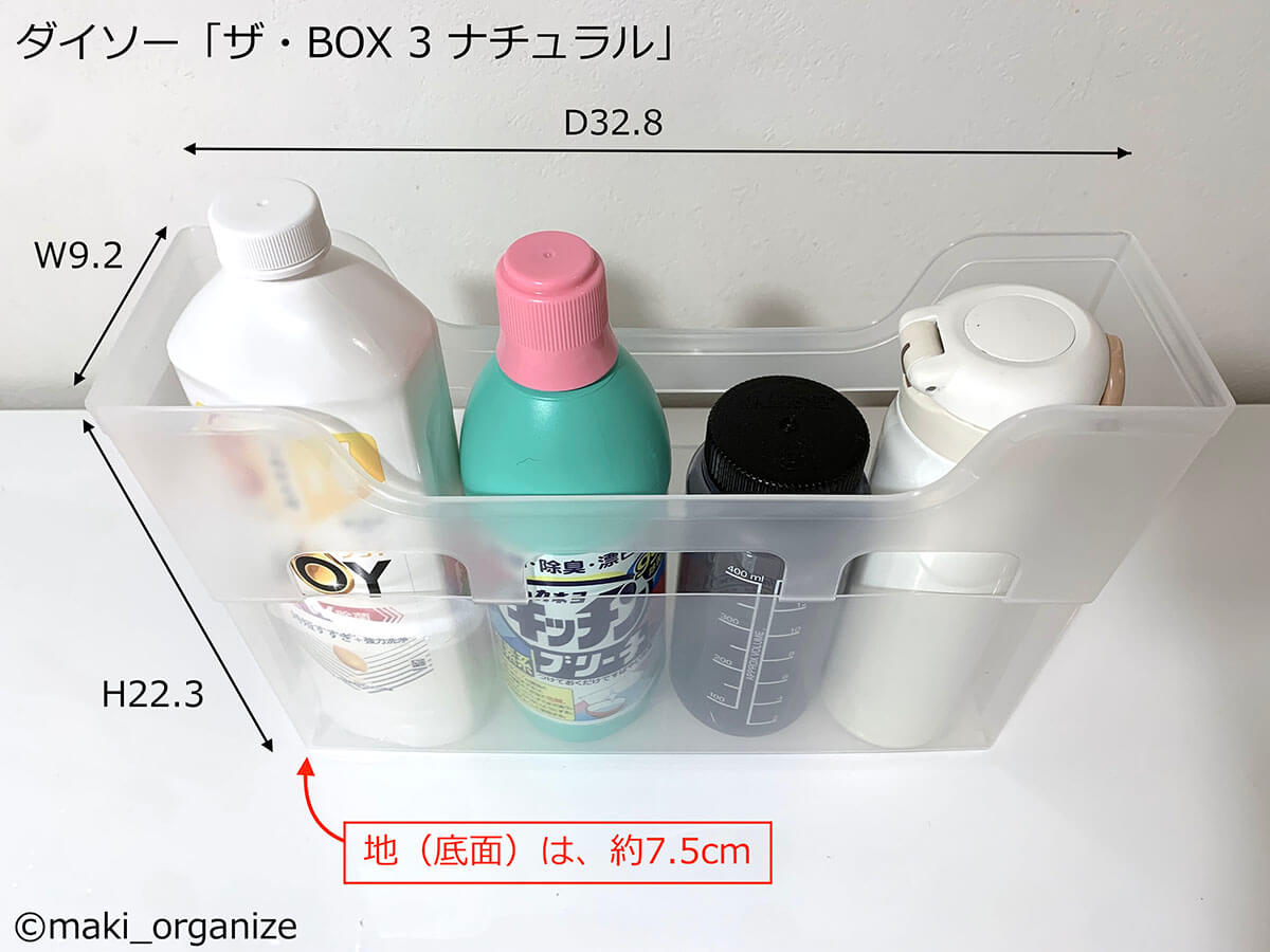 サイゾーウーマン暮らし住まい【ダイソー】ファイルBOXで調味料収納 暮らし [連載]女たちの「煩悩部屋」ビフォーアフター 【ダイソー】キッチンの調味料、収納アイテムはコレ! プロが使うファイルボックスとは? 2024/03/27 17:00 伊藤まき(収納ライター) 「汚部屋」ビフォーアフター 整理収納アドバイザーの伊藤まきさんが、片付けに悩む読者の自宅を使いやすく生まれ変わらせる連載シリーズ【「煩悩部屋」ビフォーアフター】。 連載企画『ビフォーアフター』新シーズンです。第8回目の片付けモニターは、江東区・3LDKのマンションで暮らす4人家族のKさん(35歳)。今回は、汚部屋の片付けではなく、都心のマンションに多い「狭い収納」を使いやすく手直しする特別編です。 目次 ・キッチン収納はStandard Products「PPファイルボックス」がおすすめ ・調味料のボトルは「8cm以内」が多い ・調味料ボトル収納Before→After ・水筒収納Before→After ・【ダイソー】「ザ・BOX 3 ナチュラル」もおすすめ 前回に続き、今回もキッチンのお悩みを解決。ダイソーブランドのStandard Products「PPファイルボックス」、ワッツ「A4 ファイルボックス」を活用し、調味料や水筒などボトル類の収納を手直ししました。ビフォーアフターと「ファイルボックス」選びのポイント、使い方をくわしく解説していきます。 【ファイルボックスの選び方】ボトル収納は「スリムサイズ」が正解! Standard Products「PPファイルボックス」の幅8cmタイプが◎(C)maki_organize キッチンと洗面台に多い深型の引き出し収納には「10cm未満のスリムなファイルボックス」をおすすめします。今回は330円(税込、以下同)のStandard Products「PPファイルボックス」を中心に使いますが、予算を抑えたい場合はダイソー「ザ・BOX 3 ナチュラル」110円がおすすめ! 1/3の価格で収まるのでリーズナブルです。 左端がダイソー「ザ・BOX 3 ナチュラル」。底面のサイズは筆者が測った非公式サイズです(C)maki_organize Standard Products「PPファイルボックス」のほかに使える100均の「ファイルボックス」です。収納力を増やすポイントは「底面の横幅サイズ」が小さいものを選ぶこと。例えば、写真左のダイソーと右のワッツでは「約3.3cm」もの差が。底面サイズを覚えておくと、限られた空間も有効的に使うことができます。 左から詳細になります。 ・ダイソー「ザ・BOX 3 ナチュラル」110円 品番:4993593011583/公式サイズ:W9.2×D32.8×H22.3cm ・ダイソー「ファイルボックス(ハーフ)」220円 品番:4984355715917/公式サイズ:W9.5×D32.2cm×H12.2cm ・ワッツ「A4 ファイルボックス」110円 品番:054757/公式サイズ:W12.5×D32.8×H23.1cm 【ボトルのサイズ】調味料のボトルは「8cm以内」が多い 一般的なキッチンに多い、基本的な調味料ボトル(C)maki_organize 6種類のボトルを用意し、サイズを計測してみました。結果は以下の通り。家庭で使う調味料の多くは女性が片手で持ち運べるサイズ(500〜800mL)が多いそうです。 *写真左から【ボトルの底面横幅サイズ】です ・油(約1.6L)=約10.5cm ・水(2L)=約10.5cm ・醤油(1L)=約8cm ・ぽん酢(800mL)=約7.5cm ・酢(500mL)=約7.5cm ・牛乳パック(500mL)=約7cm それでは、これらの調味料を先ほどのファイルボックスに収納してみましょう。 【検証】100均ファイルボックス3種に調味料を収納 (C)maki_organize 調味料ボトルと牛乳パックを、ダイソーとワッツの3種のファイルボックスに入れてみました。1L以内のボトルはすべて写真左「底面サイズ約7.5cm」のボックスにぴったりです。このようにサイズをきっちりマッチングさせることで、収納力がアップし横倒れも防げます。 それではいよいよファイルボックスを活用し、Kさん宅のボトル収納を手直ししていきます。 ボトル収納【Before】「ボトル」と「収納ボックス」のサイズが合っていない (Before)「液漏れ&目的の調味料が探しにくい」お悩みが(C)maki_organize 収納ボックス内に余白があります。ボトルが横に倒れて液漏れすることも多いそう。調味料の住所も変わりやすいので、探す手間も生まれます。 ボトル収納【After】Standard Products「PPファイルボックス」が正解! (After)袋入り調味料はWクリップでラベリング(C)maki_organize 使用していたボックスの横幅サイズが13cmと大きかったため、8cmのStandard Products「PPファイルボックス」と、9.5cmのダイソー「ファイルボックス(ハーフ)」に入れ替えました。 顆粒スティックなどの小さな調味料は余ったコップに入れて固定しています。これで、調味料ボトルの「横倒れによる液漏れ」問題が解決! さらに収納力もアップしたので、調味料を探すロスタイムがなくなりました。 水筒収納【Before】モノが積み重なって水筒が取り出しにくい (Before)種類が違う小物を詰め込み過ぎ(C)maki_organize ダイソー「Coloristボックスロング(横幅12.7cm)」を使って水筒や小物類を収納していました。こちらの商品は100均のファイルボックスの中でもいちばん奥行きがあるため「洗面台の収納」の方が向いています。今回はお菓子収納の仕切りボックスに再利用。 【After】8cmのファイ
