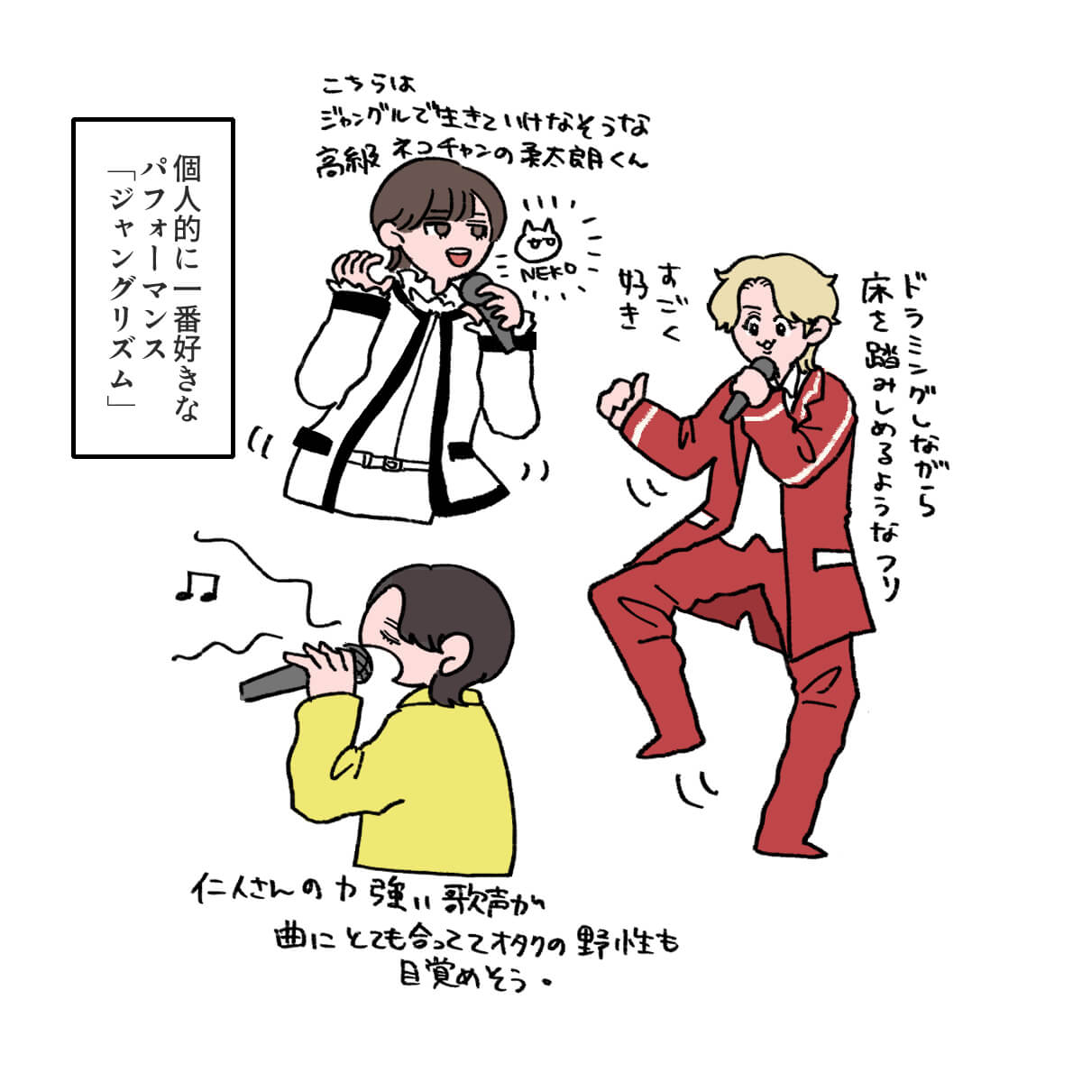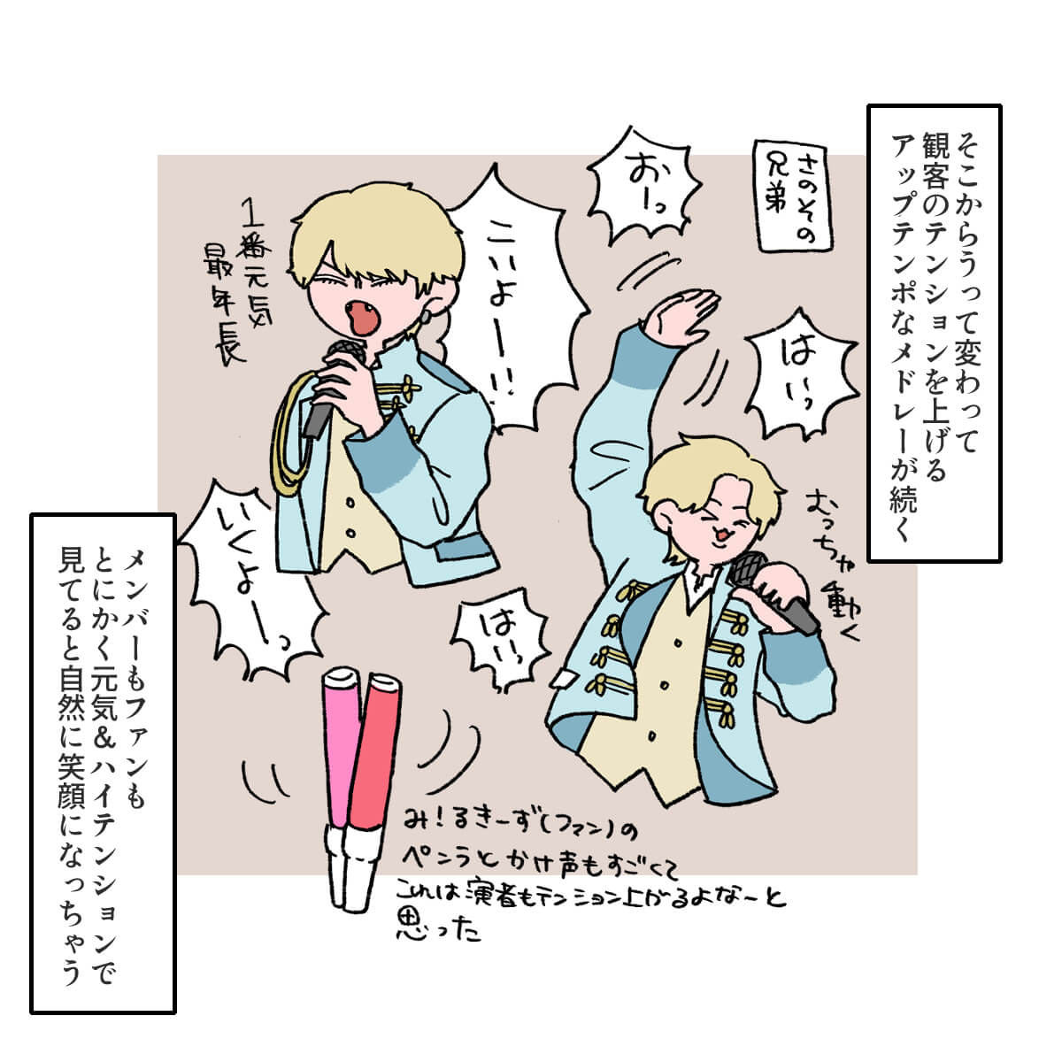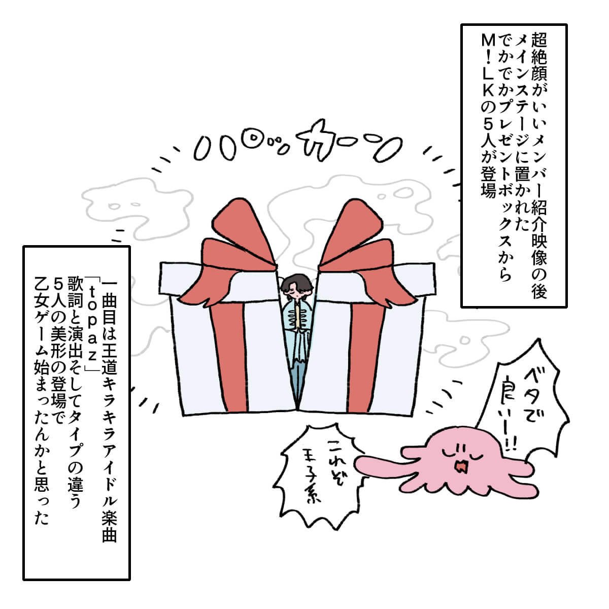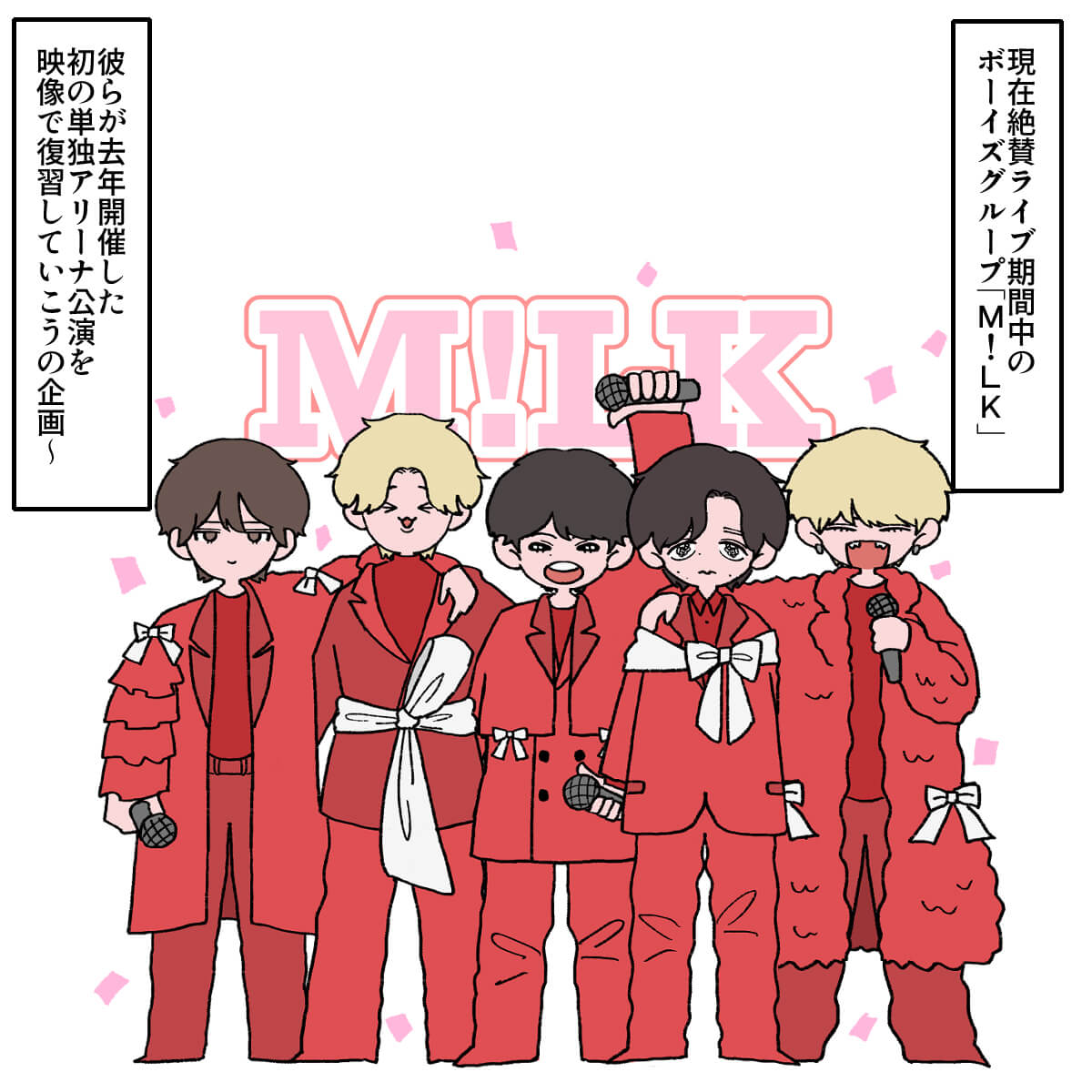 サイゾーウーマン男性アイドルM!LK、初アリーナ公演ライブ映像レビュー 男性アイドル [ドルオタ漫画家・竜田トキヒロの“推し事”見聞録]vol.52 M!LK・佐野勇斗の涙は5億で売れる! 初アリーナ公演ライブ映像レビュー 2024/04/17 21:00 竜田トキヒロ(マンガ家) BE:FIRST竜田トキヒロの“推し事”見聞録 ――Twitterで日々、STARTO ENTERTAINMENT(旧ジャニーズ事務所)のタレントをはじめとしたイラストを投稿中のドルオタ漫画家・竜田トキヒロが、現場レポートからドラマや映画、番組レビューまで、“推し事”の様子をお届け! 今回は、動画配信サービス・U-NEXTで配信されている5人組ダンスボーカルグループ・M!LKのライブ映像『M!LK 1st ARENA “HAPPY! HAPPY! HAPPY!”』レビュー! スターダストプロモーションに所属する佐野勇斗、塩﨑太智、曽野舜太、山中柔太朗、吉田仁人からなるM!LK。新人、若手男性俳優、タレントで構成されたアーティスト集団、演劇集団の「EBiDAN」(エビダン、恵比寿学園男子部の略)の一員としても活動中です。 『M!LK 1st ARENA “HAPPY! HAPPY! HAPPY!”』は、昨年10月22日に行われた彼らにとって初の単独アリーナ公演で、チケットは即日完売。約1万2千人の観客を沸かせた、メンバーにとってもファンにとっても思い入れのある公演となりました。 この記事では、ライブでのメンバー5人の魅力をイラストでご紹介していきます! 目次 ・M!LK初のアリーナ公演が「乙女ゲーム」!? ・新規ファンが一番好きなパフォーマンス ・とにかく仲良しな、メンバー5人の魅力 M!LK初のアリーナ公演、オープニングが「乙女ゲーム」みたい!? MilKの新規ファンが一番好きなパフォーマンスとは? とにかく仲良しな、メンバー5人の魅力とは? ★これまでの連載記事はこちらから 『冒険少年』M!LK・佐野勇斗の“めめ担”ムーブに、Snow Man・向井康二がマウント?――Twitterで日々、STARTO ENTERTAINMENT(旧ジャニーズ事務所)のタレントをはじめとしたイラストを投稿中のドルオタ漫画家・竜田トキヒロが、現場レポー...サイゾーウーマン2024.02.07 EBiDANの地上波初冠レギュラー番組、超特急・カイのコメントが光る!――Twitterで日々、STARTO ENTERTAINMENT(旧ジャニーズ事務所)のタレントをはじめとしたイラストを投稿中のドルオタ漫画家・竜田トキヒロが、現場レポー...サイゾーウーマン2024.01.17 竜田トキヒロ(マンガ家) 漫画家、イラストレーター。育休中に執筆したエッセイ漫画でKADOKAWAコミックエッセイ大賞受賞。Ameba、ライブドア公式ブロガーを経たのち現在はインフルエンサーとしてエンタメ、オタクに特化した漫画やイラストや体験ルポ等幅広く執筆。著書『コミュ障母さんとごきげん娘』(KADOKAWA) X:@musumenuma 最終更新:2024/04/17 21:00 気になった方はぜひU-NEXTへ! 関連記事 『冒険少年』M!LK・佐野勇斗の“めめ担”ムーブに、Snow Man・向井康二がマウント?EBiDANの地上波初冠レギュラー番組、超特急・カイのコメントが光る!BE:FIRST・SOTAに天使と悪魔が同居!? ライブドキュメンタリー『BE:the ONE』レビュー坂本昌行が7 MEN 侍に送った“何よりの褒め言葉”とは? 『GIFT for X』最終回イラストレポAぇ! group『Aッ倒的ファン大感謝祭』イラストレポ、関西ジュニアはまるで“大家族”! 次の記事 「BE:FIRSTと嵐は違う」ファン公言の大島美幸、“推し活スタイル”の違い語り反響 >