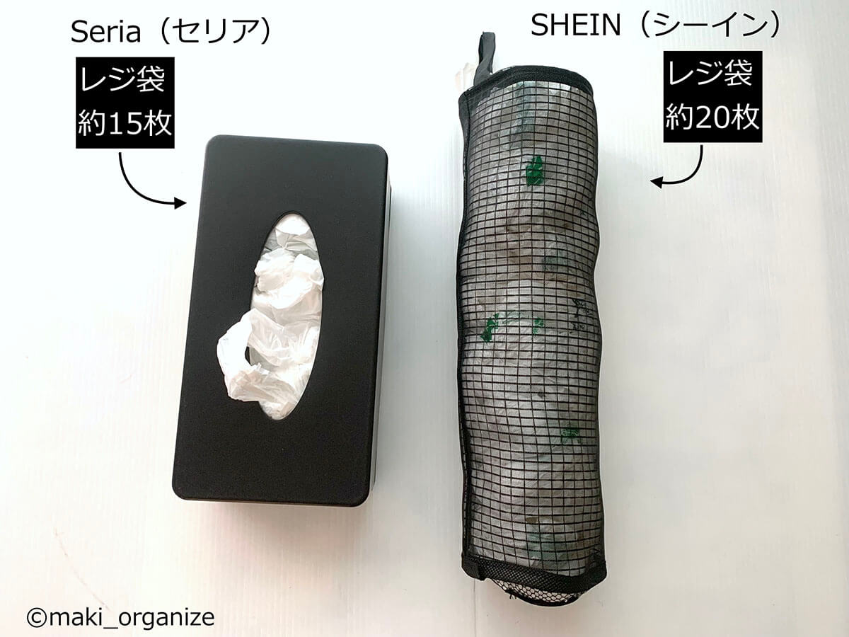 かさばる「使用済みのレジ袋」収納には、SHEIN(シーイン)「ビニール袋ホルダー」とセリア「ボックスティッシュケース」がイチオシ! 袋を詰め込んで「圧縮収納」すれば、スッキリまとめることができます。