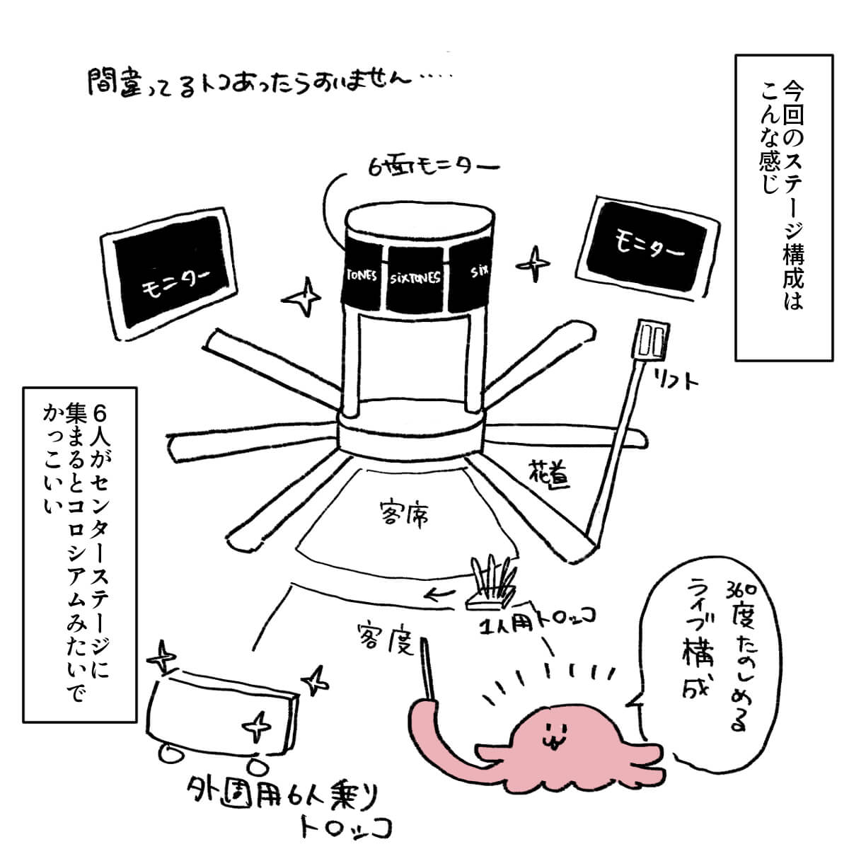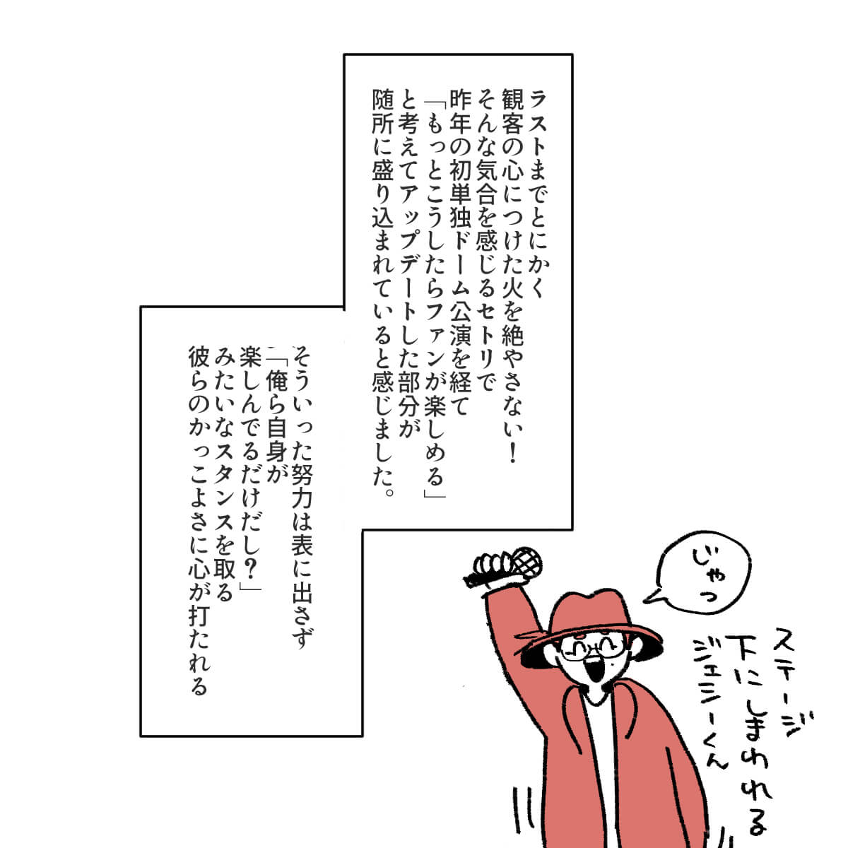 サイゾーウーマンSixTONESドーム公演『VVS』イラストレポ その他 [ドルオタ漫画家・竜田トキヒロの“推し事”見聞録]vol.53 田中樹の“ファンサ”に沼る!? SixTONESドーム公演『VVS』レポート 2024/04/24 21:00 竜田トキヒロ(マンガ家) SixTONES竜田トキヒロの“推し事”見聞録 ――Twitterで日々、STARTO ENTERTAINMENT(旧ジャニーズ事務所)のタレントをはじめとしたイラストを投稿中のドルオタ漫画家・竜田トキヒロが、現場レポートからドラマや映画、番組レビューまで、“推し事”の様子をお届け! 今回は、4月20~22日に東京ドームで行われたSixTONESのコンサート『SixTONES LIVE TOUR 2024 VVS』をレポート! SixTONESは、今年1月に4枚目アルバム『THE VIBES』をリリースし、同作を引っ提げ、2月からスタートした初の4大ドームツアーは、大阪、福岡、名古屋をまわり、今月20からの3日間は、最後の会場となる東京ドームにて公演を実施。 360度ステージで生バンドの演奏もあり、『THE VIBES』収録の新曲やユニット曲、ジュニア時代から歌われてきたものを含めた人気曲など、全33曲を披露しました。 いったいどんな内容になっていたのか、この記事では、メンバー6人の印象に残ったシーンなどをイラストでご紹介していきます! 目次 ・森本慎太郎に「バイブス上がってる」 ・田中樹に「沼る」“ファンサ”とは? ・「孫の代まで語りたい」メンバー6人の姿 ・SixTONESドーム公演で感じた“確信” SixTONES・森本慎太郎に「バイブス上がってる」と感じたワケ SixTONES・田中樹に「沼る」“ファンサ”とは? 「孫の代まで語りたい」SixTONESメンバー6人の姿 思わず泣きそうに? SixTONESドーム公演で感じた“確信” ★これまでの連載記事はこちらから 【ジャニオタマンガ】SixTONESが初ドームでマッドマックス化? 『慣声の法則』参戦レポ――Twitterで日々、ジャニーズタレントにまつわるイラストを投稿中のジャニオタ漫画家・竜田トキヒロが、現場レポートからドラマや映画、番組レビューまで、“推し事”の様子を...サイゾーウーマン2023.04.26 【ジャニオタマンガ】SixTONES・ジェシーの悪役が怖すぎる!? 映画『リボルバー・リリー』レビュー――Twitterで日々、ジャニーズタレントにまつわるイラストを投稿中のジャニオタ漫画家・竜田トキヒロが、現場レポートからドラマや映画、番組レビューまで、“推し事”の様子を...サイゾーウーマン2023.08.16 【ジャニオタマンガ】Snow Man&SixTONES『少クラ』卒業回をプレイバック!――Twitterで日々、ジャニーズタレントにまつわるイラストを投稿中のジャニオタ漫画家・竜田トキヒロが、現場レポートからドラマや映画、番組レビューまで、“推し事”の様子を...サイゾーウーマン2023.04.12 竜田トキヒロ(マンガ家) 漫画家、イラストレーター。育休中に執筆したエッセイ漫画でKADOKAWAコミックエッセイ大賞受賞。Ameba、ライブドア公式ブロガーを経たのち現在はインフルエンサーとしてエンタメ、オタクに特化した漫画やイラストや体験ルポ等幅広く執筆。著書『コミュ障母さんとごきげん娘』(KADOKAWA) X:@musumenuma 最終更新:2024/04/24 21:42 公演中におにぎりを食べるの、斬新すぎ 関連記事 【ジャニオタマンガ】SixTONES・ジェシーの悪役が怖すぎる!? 映画『リボルバー・リリー』レビュー【ジャニオタマンガ】SixTONESが初ドームでマッドマックス化? 『慣声の法則』参戦レポ【ジャニオタマンガ】Snow Man&SixTONES『少クラ』卒業回をプレイバック!SixTONES、ドーム公演でNumber_i「GOAT」披露も「配慮がない」? ネットで賛否両論SixTONES・田中樹は「大変だった」? ドーム公演で『ハマダ歌謡祭』公開収録に賛否 次の記事 ビーファ、MVの考察でファン白熱 >