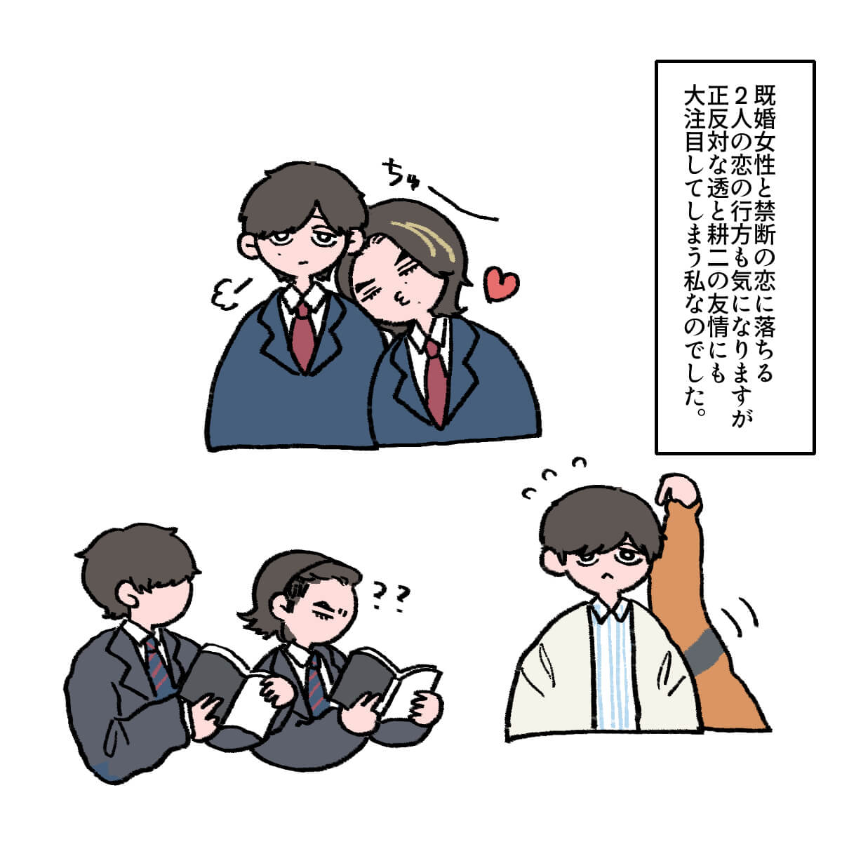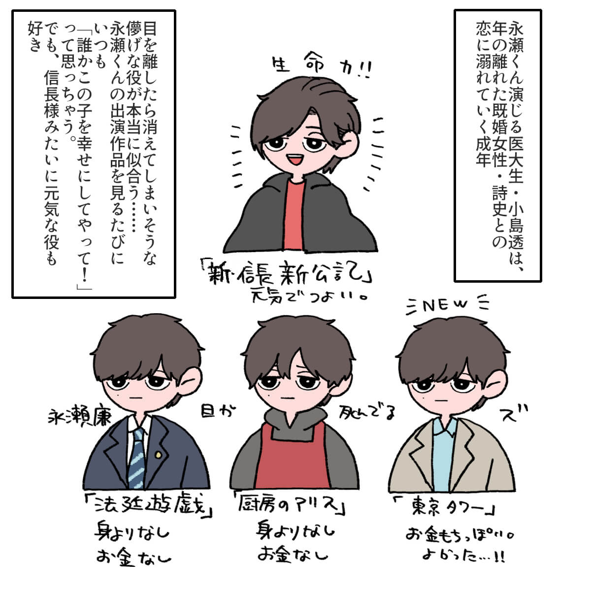 サイゾーウーマン男性アイドルSTARTO(旧ジャニーズ)King&Prince永瀬廉『東京タワー』永瀬廉がヒロインすぎる 男性アイドル [ドルオタ漫画家・竜田トキヒロの“推し事”見聞録]vol.55 『東京タワー』キンプリ・永瀬廉は目が死んでる役が似合う! 詩史との食事シーンが美しいわけ 2024/05/08 21:00 竜田トキヒロ(マンガ家) 永瀬廉King&Prince竜田トキヒロの“推し事”見聞録 ――Twitterで日々、STARTO ENTERTAINMENT(旧ジャニーズ事務所)のタレントをはじめとしたイラストを投稿中のドルオタ漫画家・竜田トキヒロが、現場レポートからドラマや映画、番組レビューまで、“推し事”の様子をお届け! 今回は、King&Prince・永瀬廉が主演を務めるドラマ『東京タワー』(テレビ朝日系)をレビュー! 『東京タワー』は、不倫を題材にした美しくも許されない恋を描いた江國香織氏の同名小説(2001年、マガジンハウス)が原作。医大生・小島透(永瀬)と、20歳以上年の離れた人妻・浅野詩史(板谷由夏)による恋愛模様を描き、05年には岡田准一(当時はV6)と黒木瞳で映画化されました。 また、映画で嵐・松本潤が演じた大学生・大原耕二と人妻・川野喜美子(寺島しのぶ)による“もう1つの禁断の恋”には、Travis Japan・松田元太とMEGUMIが挑んでいます。 4月20日の初回は、動画配信サービスでの見逃し配信の再生数が200万回を突破(21~27日、ビデオリサーチ調べ)するなど、大きな話題を集めている同ドラマ。この記事では、最新の第3話までで印象に残ったシーンなどをイラストでご紹介していきます! 目次 ・King&Prince・永瀬廉、儚げな役がピッタリ! ・King&Prince・永瀬廉がヒロインすぎる! ・Travis Japan・松田元太との友情にも大注目! King&Prince・永瀬廉は、儚げな役がピッタリ! ドラマ『東京タワー』、King&Prince・永瀬廉がヒロインすぎる! King&Prince・永瀬廉とTravis Japan・松田元太の友情にも大注目! ★これまでの連載記事はこちらから 【4月期深夜ドラマ】キンプリ永瀬廉『東京タワー』、TVerお気に入り登録者トップ! STARTO出演作ランキング King&Prince(以下、キンプリ)の永瀬廉が主演を務める連続ドラマ『東京タワー』(テレビ朝日系、毎週土曜午後11時~)が、ファンの間で高い注目を集めている。...サイゾーウーマン2024.04.30 キンプリ・永瀬廉、ドラマ『東京タワー』の“濡れ場”に言及! 「岡田くんみたいには……」 King&Prince・永瀬廉がパーソナリティを務めるラジオ番組『King&Prince 永瀬廉のRadioGARDEN』(文化放送)。4月17日深夜放送回は、主...サイゾーウーマン2024.04.21 【ジャニオタマンガ】映画『法廷遊戯』で気づいた、キンプリ・永瀬廉の“声”の良さ――Twitterで日々、ジャニーズタレントにまつわるイラストを投稿中のジャニオタ漫画家・竜田トキヒロが、現場レポートからドラマや映画、番組レビューまで、“推し事”の様子を...サイゾーウーマン2023.11.15 竜田トキヒロ(マンガ家) 漫画家、イラストレーター。育休中に執筆したエッセイ漫画でKADOKAWAコミックエッセイ大賞受賞。Ameba、ライブドア公式ブロガーを経たのち現在はインフルエンサーとしてエンタメ、オタクに特化した漫画やイラストや体験ルポ等幅広く執筆。著書『コミュ障母さんとごきげん娘』(KADOKAWA) X:@musumenuma 最終更新:2024/05/08 21:06 目、死んでるのが役超えてガチで心配 関連記事 【4月期深夜ドラマ】キンプリ永瀬廉『東京タワー』、TVerお気に入り登録者トップ! STARTO出演作ランキングキンプリ・永瀬廉、ドラマ『東京タワー』の“濡れ場”に言及! 「岡田くんみたいには……」【ジャニオタマンガ】映画『法廷遊戯』で気づいた、キンプリ・永瀬廉の“声”の良さキンプリ・永瀬廉、GWの話題は「ほんまだるい」! 「ファンの人とか何してんのやろ?」興味津々キンプリ・永瀬廉、「今後出ないやん。あんなグッズ」自身の顔をプリントした公式グッズとは? 次の記事 ビーファMANATOとJO1 祥生 、LDH時代を懐古 >