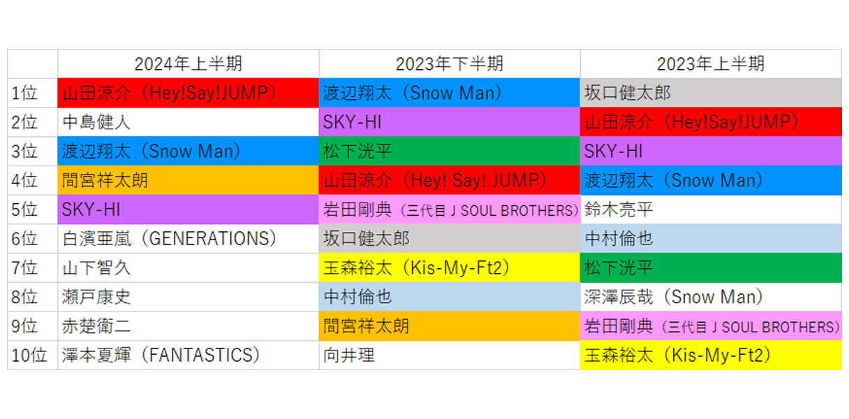サイゾーウーマン男性アイドル「ViVi国宝級イケメンランキング」を分析 男性アイドル 編集部コラム 八木勇征が10万ポイント増で殿堂入り! 「ViVi国宝級イケメンランキング2024年上半期」の結果を分析 2024/07/18 21:00 サイゾーウーマン編集部 男性アイドル編集部コラムSTARTO 「ViVi」2024年09月号(講談社) ファッション誌「ViVi」(講談社)が半年に1回行っている人気企画「国宝級イケメンランキング」。公式サイトで行われたアンケートの集計結果と、2024年上半期の話題性・活躍度を考慮してポイント化し、ランキングを決定するというもので、7月16日に2024年上半期のランキング結果が発表されました。 この記事では、各部門の結果を詳しく分析していきます。 目次 ・「ViVi国宝級イケメンランキング2024年上半期」3部門の結果一覧 ・NOW部門、八木勇征がぶっちぎり ・NEXT部門、INI・池崎理人の躍進に注目! ・ADULT部門、STARTO勢がトップ3独占 「ViVi国宝級イケメンランキング2024年上半期」3部門の結果一覧 NOW部門 NEXT部門(22歳以下が対象) ADULT部門(30歳以上が対象) 1位 八木勇征(FANTASTICS) 宮世琉弥 山田涼介(Hey!Say!JUMP) 2位 萩原利久 佐野晶哉(Aぇ! group) 中島健人 3位 京本大我(SixTONES) 池崎理人(INI) 渡辺翔太(Snow Man) 4位 高橋文哉 山下幸輝 間宮祥太朗 5位 道枝駿佑(なにわ男子) 窪塚愛流 SKY-HI 6位 川西拓実(JO1) 杢代和人(原因は自分にある。) 白濱亜嵐(GENERATIONS) 7位 高橋海人(King&Prince) 柏木悠(超特急) 山下智久 8位 ラウール(Snow Man) 岩瀬洋志 瀬戸康史 9位 尾崎匠海(INI) HARUA(&TEAM) 赤楚衛二 10位 K(&TEAM) 浮所飛貴(美 少年) 澤本夏輝(FANTASTICS) 11位 松田元太(Travis Japan) 豆原一成(JO1) 12位 綱啓永 RAN(MAZZEL) 13位 板垣李光人 深田竜生(少年忍者) 14位 樋口幸平 山中柔太朗(M!LK) 15位 末澤誠也(Aぇ! group) YU(NEXZ) 5月9日~6月10日の約1カ月間、公式サイトで投票を受け付けていた2024年上半期の「ViVi国宝級イケメンランキング」は、上記のような結果となり、ボーイズグループ所属メンバーが多数ランクイン。 なお、それぞれの所属事務所を見ると、3部門合わせて、STARTO ENTERTAINMENT(旧ジャニーズ事務所)所属タレントは12名と最も多く、スターダストからは5名、LDHとLAPONEエンタテインメントは3名ずつ、BMSGとHYBE LABELS JAPANからはそれぞれ2名が15位内に入りました。 以下では、2023年上半期・下半期の結果を振り返りつつ、各部門の結果を詳しく見ていきます。 「ViVi国宝級イケメンランキング2024年上半期」NOW部門、FANTASTICS・八木勇征がぶっちぎりで1位に 「国宝級イケメンランキング」で殿堂入りしたFANTASTICS・八木勇征(Getty Images) 複数回ランクインしているタレントを色別に示しています(C)サイゾーウーマン 「ViVi国宝級イケメンランキング」のメインともいえる「NOW部門」は、FANTASTICS from EXILE TRIBEの八木勇征が、40万8,776とぶっちぎりのポイント数で連覇を達成。2023年下半期の31万211ポイントから約10万数字を伸ばし、40万8,776ポイントでぶっちぎりでトップに立ち、めでたく「殿堂入り」を果たしました。 八木といえば、 凪良ゆう氏のボーイズラブ小説(徳間書店)を実写化し、昨年4月には映画も公開された主演ドラマ『美しい彼』シリーズ(TBS系)がきっかけでブレーク。その人気は国内にとどまらず、海外でも多くのファンを獲得しています。 以降、多くの作品に出演しており、主演映画『矢野くんの普通の日々』(11月予定)、『僕らは人生で一回だけ魔法が使える』(来年予定)の公開がそれぞれ控えるなど大活躍なだけに、1位は納得の結果といえるでしょう。 なお、その『美しい彼』でダブル主演を務めた萩原利久は、32万2,491ポイントで前回から4ランクアップし2位に。カップル役を演じた2人の今後の活躍ぶりに期待したいところです。 「ViVi国宝級イケメンランキング2024年上半期」NEXT部門は、INI・池崎理人の躍進に注目! 複数回ランクインしているタレントを色別に示しています(C)サイゾーウーマン 22歳以下が対象の「NEXT」部門は、前回、前々回に3位だった宮世琉弥が13万8227ポイントを稼ぎ、2ランクアップで1位に輝きました。 宮世は3月公開の映画『恋わずらいのエリー』で原菜乃華とダブル主演を務め、4月期放送のドラマ『くるり〜誰が私と恋をした?〜』(TBS系)では生見愛瑠の元恋人の年下男子役を好演したのが記憶に新しいところ。「ViVi」編集部からは、「小年感と色気の最強ブレンド 究極の“年下系男子”ついに次世代の頂へ」と評されています。 そのほか、「NEXT」部門で注目すべきは3位のINI・池崎理人の躍進ぶりです。低音イケメンボイスを生かし、グループではラップを担当している彼は、目鼻立ちがくっきりとした整った顔立ちで、今回、「国宝級イケメンランキング」に初登場。個人でのドラマやバラエティ出演の機会は少ないだけに、今後露出が増えれば、さらなる人気を得られそうです。 「ViVi国宝級イケメンランキング2024年上半期」ADULT部門、STARTO勢がトップ3を独占 複数回ランクインしているタレントを色別に示しています(C)サイゾーウーマン 30歳以上を対象