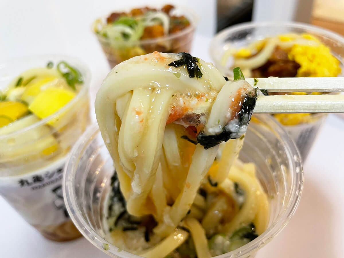 サイゾーウーマン暮らし食べ物丸亀製麺、運営会社が純利益43%減 暮らし 人気チェーン店、実食レビュー 【丸亀製麺】運営会社が純利益43%減でも……「シェイクうどん」食べてわかった「攻め」の意欲 2024/08/15 13:00 仲宗根由紀子(エンタメライター) 暮らし丸亀製麺 丸亀製麺の看板(C)サイゾーウーマン はなまるうどん、杵屋など数あるうどんチェーンの中で、売上高・店舗数ともに群を抜いている「丸亀製麺」。昨年、何かと話題になった「シェイクうどん」が復活したと聞きつけ、早速食べてきました! ※2024年4月23日公開の記事を再編集しています。 目次 ・【丸亀製麺】トリドールホールディングス、純利益43%減 ・丸亀はうどんチェーン売上高首位 ・「シェイクうどん」購入でミス! ・「シェイクうどん」4種をチェック ・「シェイクうどん」を実食! ・丸亀製麺はコスパ良すぎ ※価格はすべて税込。 ※価格やメニューは2024年4月22日時点の情報です。 ※店舗によって価格やメニューおよびシステムが異なることがあります。 ※最新の情報は公式サイトや公式SNSをご確認ください。 【丸亀製麺】トリドールホールディングス、純利益43%減 丸亀製麺などを運営するトリドールホールディングス。2024年4〜6月期の連結決算は、純利益が前年同期比で43%減の15億円だったと「日本経済新聞」で報じられました。 一方、売上高にあたる売上収益は25%増の658億円。本業のもうけを示す「事業利益」は13%増の44億円、特に「丸亀製麺」の事業利益は22%増と業績をけん引したとのこと。米国、英国、香港での海外飲食事業が足を引っ張ったとされています。 【丸亀製麺】2位の「はなまるうどん」を引き離しトップ! 全国に800店舗以上を運営する丸亀製麺。うどんチェーンの店舗数では、2位のはなまるうどんの444店舗(2023年2月時点)に大差をつけており、売上高でもうどん業界で独走状態が長年続いています。 その魅力は、なんといっても店舗で小麦粉から作る打ち立て麺! 店舗に入るとまず目に飛び込んでくる製麺機は、この上ない説得力を漂わせています。 そんな絶対王者である丸亀製麺ですが、昨年5月には、テイクアウト商品「丸亀シェイクうどん」がメニューに新登場。販売開始早々に、SNSユーザーが「うどんにカエルが混入している」と訴える騒動はあったものの、発売から約2カ月半で累計販売数250万食を突破するほどの人気を誇りました。 そして、今月16日から「丸亀シェイクうどん」がメニューに再登場! ラインアップは、新メニュー3種と再登場メニュー2種の計5種となっています。 テイクアウト専用「丸亀シェイクうどん」全5種類 ・よくばりシェイクうどん(新作) 540円 ・鶏から塩レモンシェイクうどん(新作) 690円 ・ピリ辛 油淋鶏シェイクうどん(新作) 690円 ・明太とろろシェイクうどん(再登場) 390円 ・凍らせ塩レモンシェイクうどん(再登場) 490円 ※販売期間:6月中旬まで 今回は4種類を購入し、実食してみます。 【丸亀製麺】「シェイクうどん」がない……テイクアウト非対応店舗にご注意を 「シェイクうどん」どこ!?(C)サイゾーウーマン 早速、某駅構内の「丸亀製麺」へ到着。しかし、「シェイクうどん」のメニューが見当たりません。 キョロキョロしていると、「テイクアウトメニューは扱っておりません」の貼り紙を発見。どうやら「丸亀製麺」にはイートイン専門店舗があるようです。 ちゃんと事前に調べてから行くべきでした……。皆さまもご注意くださいね。 テイクアウトに対応している店舗!(C)サイゾーウーマン 気を取り直して、今度はテイクアウト商品も扱っている「丸亀製麺」に到着。 テイクアウトのメニュー表(C)サイゾーウーマン やはり、メニュー表でも「シェイクうどん」が押されていました。小ぶりに見えますが、「うどん1玉(並)入ってます!」とのこと。 テイクアウト専用レジ(C)サイゾーウーマン 注文すると、目の前で手際よく「シェイクうどん」が作られていきます。 持ち帰る際、袋の底に丸い穴が開いた段ボールを敷いてくれたので、スタバでテイクアウトした時のような安定感がありました。 【丸亀製麺】「シェイクうどん」新作含む4種をチェック! シェイク前のうどん(C)サイゾーウーマン 新作含む4種を持ち帰りまりました。パッケージのデザインがかわいい! イラストはおしゃれな線画が人気の長場雄氏が手掛けているそう。このイラストを見ていると、「丸亀製麺」の店員さんが愛おしく思えてきます。 新作の「よくばりシェイクうどん」(C)サイゾーウーマン 「よくばりシェイクうどん」(540円)は、「お子さまから大人まで、大好きなおかずを集めたよくばりな一杯」とのこと。打ち立てのうどんに、鶏のから揚げ、ハンバーグ、赤ウインナー天、かきたまが豪快にのっています。 新作の「ピリ辛 油淋鶏シェイクうどん」(C)サイゾーウーマン 「ピリ辛 油淋鶏シェイクうどん」(690円)は、鶏からにピリ辛の油淋鶏たれとラー油、白ねぎを添えた一杯。 ふたを開けた瞬間にタレの香りが強め