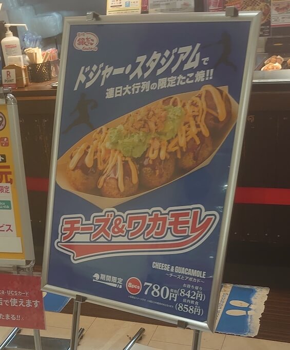 最寄りの店舗を訪れてみると、店舗のパネルには「一平ちゃん夜店の焼そば味 たこ焼」を宣伝するパネルが。ほかにも、人気アニメ『推しの子』や、大谷翔平選手が所属するMLBチームのロサンゼルス・ドジャースとのコラボなども行っているようで、こちらも宣伝する垂れ幕やパネルが置いてありました。