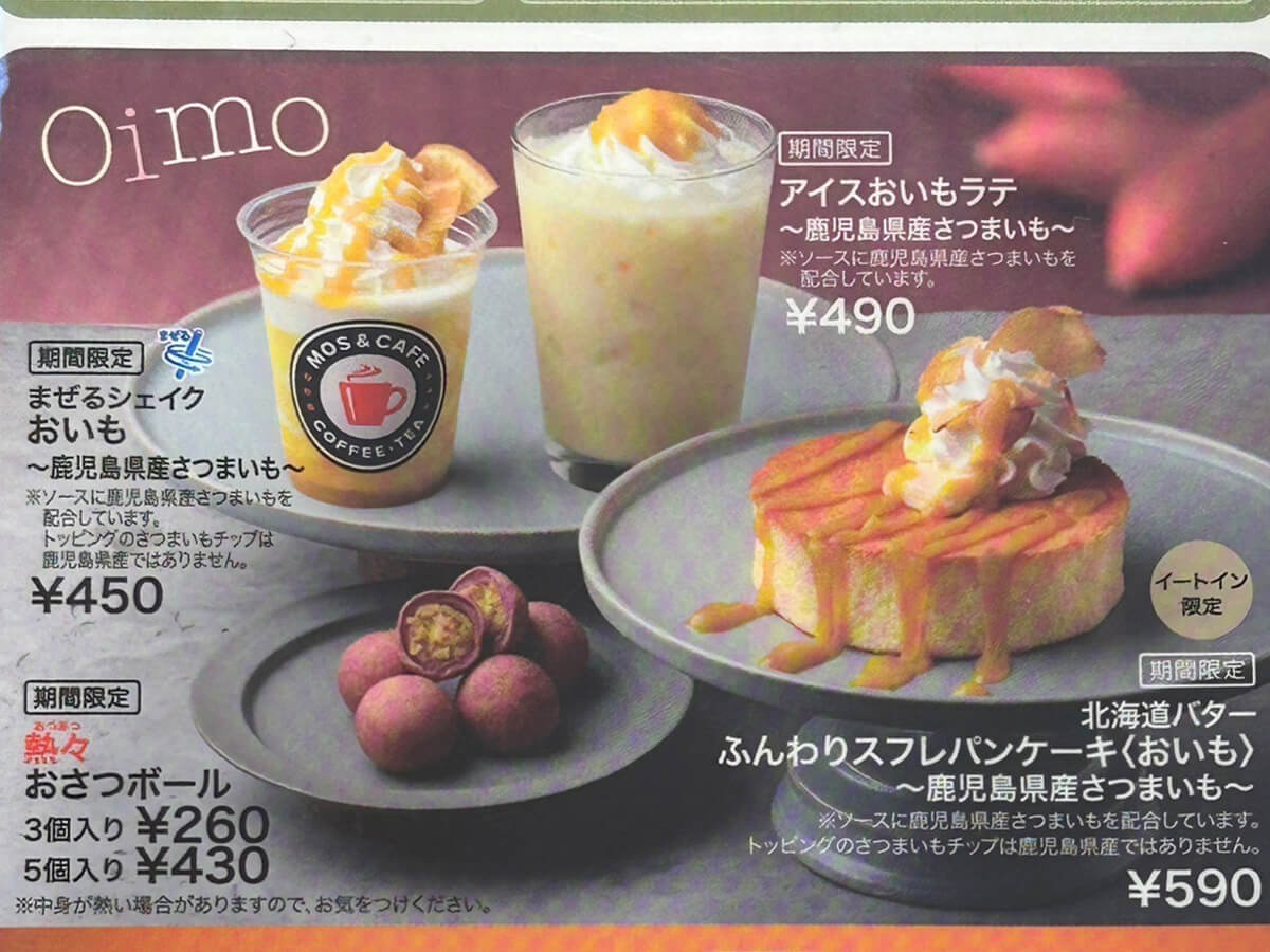サイゾーウーマン暮らし食べ物【モスバーガー&カフェ】のスイーツ実食 暮らし 話題の新商品レビュー 73店舗に拡大【モスバーガー&カフェ】、590円期間限定「スフレパンケーキ」が想像以上だった! 2024/09/19 21:30 サイゾーウーマン編集部 「モスバーガー&カフェ」の外観(C)サイゾーウーマン モスバーガーを運営するモスフードサービスのカフェ事業のひとつ「モスバーガー&カフェ」。9月11日から期間限定のスイーツが販売されているということで、編集部員Mが実際に店舗で食べてきました! ※価格や商品は2024年9月19日時点の情報です。 ※最新の情報は公式サイトや公式SNSをご確認ください。 ※店舗によって取り扱う商品が異なります。 目次 ・モスバーガー&カフェ、店舗拡大中 ・秋冬限定の「さつまいも」新メニュー4品 ・「ふんわりスフレパンケーキ<おいも>」を実食 ・ドリンクセットがオススメなワケ モスバーガーのカフェ業態【モスバーガー&カフェ】、店舗拡大中 モスバーガーの新業態として2019年11月に1号店がオープンした「モスバーガー&カフェ」。オリジナルスイーツやカフェドリンクを楽しめるモスバーガーのカフェタイプのお店です。 モスバーガーはかつて、10年11月に同様のカフェ型店舗「モスカフェ」を開業。ハンバーガーのほか、タコライスやハンバーグ、カレー、サラダなどのオリジナルメニューを提供し、一時は各地に10店舗以上店があったものの、業績が振るわず21年8月頃までには4店舗にまで減少。のちに「モスカフェ」としての看板は下ろされました。 しかしその後、既存店を「モスバーガー&カフェ」としてリニューアルオープンしたり、新規出店を行い、現在は全国に73店舗を展開するまでに規模を拡大しています。 なお、運営元であるモスフードサービスの企業公式サイトで公開されている情報によれば、23年度の連結経営成績は、売上高が930億58百万円(前期比9.4%増)と過去最高を更新。営業利益は41億85百万円で増収増益となり、前期は赤字だった中、最終損益は25億73百万円の黒字に転換したといいます。この結果には、「モスバーガー&カフェ」の成長も影響していることでしょう。 今回は、そんな注目の「モスバーガー&カフェ」で、新作スイーツを実食してきました! 【モスバーガー&カフェ】秋冬限定の「さつまいも」新メニュー4品を発売! (写真:サイゾーウーマン) 9月11日に新発売した期間限定スイーツは、さつまいもを使用した以下の4品。 ・「北海道バター ふんわりスフレパンケーキ<おいも> ~鹿児島県産さつまいも~」(単品590円/ドリンクセット850円) 販売期間:24年9月11日(水)~25年1月下旬 ※イートイン専用商品 ・「熱々おさつボール」(3個入り260円/5個入り430円) 販売期間:24年9月11日(水)〜2024年11月中旬頃 ・「アイスおいもラテ ~鹿児島県産さつまいも~」(Mサイズ490円) 販売期間:24年9月11日(水)~11月中旬 ・「まぜるシェイク おいも ~鹿児島県産さつまいも~」(Sサイズ450円) 販売期間:24年9月11日(水)~11月中旬 「モスバーガー&カフェ」では、「ふんわりスフレパンケーキ」が看板スイーツのようだったため、今回は、秋冬限定のスフレパンケーキ「<おいも> ~鹿児島県産さつまいも~」味を食べてみることにしました。 「北海道バター ふんわりスフレパンケーキ<おいも>」を実食! 「モスバーガー&カフェ」のメニューの一部(写真:サイゾーウーマン) こちらが実物の写真。私は850円のドリンクセットを購入しました。 厚みも十分です(C)サイゾーウーマン スマホの計測アプリを使用してパンケーキのサイズを測ったところ、直径約11cm、厚さは3.5~4cmほどありました。 ナイフを入れてみたところ、生地はふわっふわ! おそらく冷凍したものを解凍しているため、店で焼き上げる某「星〇珈琲店」の「スフレパンケーキ」のように、表面がカリッとする感じはなく、ややしっとりしていました。 生地のふわふわ感、写真で伝わらないのが残念(C)サイゾーウーマン まずはなにもつけずにそのまま食べてみると、生地自体に甘みがあって、このままでもおいしい! また、ホイップクリームは想像よりも甘さ控えめで、スフレにつけて食べても、そこまで甘くなりすぎず、ちょうどいい塩梅でした。 別添えの濃厚なさつまいもソース(C)サイゾーウーマン そして、鹿児島県産「紅はるか」と黄金色の「マロンゴールド」のペーストが使われているという肝心のソースは、焼き芋にしたときの蜜の部分をそのままソースにしたような感じでかなり濃厚。口に入れた瞬間、ねっとりとした甘みが広がります。 クリームの上にトッピングされているさつまいもチップは、素材の味がそのまま生かされた素朴な味で、ソースをつけて食べてみたところ、同じさつまいもでも調理の仕方でこんなに変わるのかと、味の広がり方に違いがあって、楽しかったです。 バターは先に全体に塗っておくのをおすすめします(C)サイゾーウーマン なお、生クリームの下に北海道バターが隠れていることに気づかず食べ進めていたのですが、ある