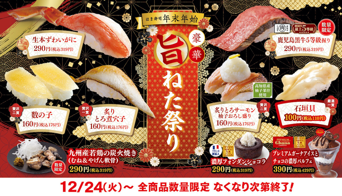 サイゾーウーマン暮らし食べ物回転すしチェーン年末年始フェア 暮らし 【くら寿司】【はま寿司】年末年始フェア、豪華なネタが大集結! 休まず営業 2024/12/31 13:00 サイゾーウーマン編集部(@cyzowoman) くら寿司(写真:サイゾーウーマン) 外食の機会も増える年末年始。気軽に利用できる回転すしチェーンの年末年始フェアの情報をまとめます。 目次 ・【くら寿司】12月27日から「年末年始」フェア ・【くら寿司】年末年始の営業時間について ・【はま寿司】12月24日から「年末年始」フェア ・【はま寿司】年末年始の営業時間について 【くら寿司】「年末年始」フェアの内容 (プレスリリース) 12月27日から「年末年始」フェアを開催中。いくら、うに、かに、かずのこ、寒ぶり、金目鯛、黒毛和牛、豪華食材が大集結。年末年始も休まず営業。 (プレスリリース) 塩いくら(一貫) 190円 販売期間:12月27日(金)~1月5日(日) (プレスリリース) 特大金目鯛(一貫) 230円 販売期間:12月27日(金)~1月5日(日) ※数量限定 (プレスリリース) 国産無添加うに(一貫) 420円 販売期間:1月1日(水)~1月3日(金) ※お持ち帰り不可 ※化学調味料・人工甘味料・合成着色料・人工保存料に加え、ミョウバンも無添加 (プレスリリース) かずのこ 280円 販売期間:12月27日(金)~1月5日(日) ※数量限定 そのほか…… ・【徳島県産】大型寒ぶり 280円 ・黒毛和牛にぎり ・ボイル本ズワイガニ大(一貫) 280円 ・活〆特大えび(一貫) 115円 年末年始の営業時間について ※営業時間が異なる店舗がございます。詳しくはHPをご確認ください。 【2024年】 12月31日(火) 10:20~21:00 【2025年】 1月1日(水) 11:00~22:00 1月2日(木)・3日(金) 10:20~23:00 1月4日(土)より、通常通りの営業となります。 【はま寿司】「年末年始」フェアの内容 (プレスリリース) 12月24日より、「はま寿司 年末年始豪華旨ねた祭り」を全国の店舗で開催。「生本ずわいがに」「鹿児島黒牛5等級握り」が、至福の一貫シリーズに登場します。 (プレスリリースより) 炙りとろサーモン 柚子おろし盛り 160円(税込176円) (プレスリリースより) 生本ずわいがに 290円(税込319円) (プレスリリースより) 鹿児島黒牛5等級握り 290円(税込319円) (プレスリリースより) 数の子 160円(税込176円) (プレスリリースより) 炙りとろ煮穴子 160円(税込176円) 年末年始の営業時間について 年末年始の営業詳細 最終更新:2024/12/31 13:00 次の記事 『紅白』歴代視聴率一覧 >