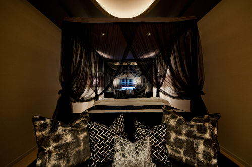 では実際に、オザワ氏はどのような空間を作っているのだろう。彼女の最新作である新潟県新潟市「月とうさぎ」は、ぼんやりと柔らかな外観ライトの照明をくぐると、その先には和紙や木に囲まれた和空間が広がる作りになっている。室内で特徴的なのは、墨色に染められた透け感のある素材で作られた天蓋。白×レースが一般的なところを墨色にした分、派手さはないが、女性の肌を少し綺麗に映すのではないかと期待させる。