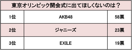 2020年に開催を控えている「東京オリンピック・パラリンピック」だが、競技の話題よりも「開会式に誰が出演するのか?」という点に人々の関心が集まっている。日本を世界にアピールする役割を担うだけに、その人選は重要視されているようだ。その一方、ネット上では“出てほしくない”アーティストとして「AKB48」「ジャニーズ」「EXILE」の名前がよく取り沙汰されている。今回はこの3組を対象に、男女100名に「東京オリンピック開会式に出てほしくないのは?」という調査を実施した。(Sagooooワークス調べ/調査地域:全国/調査対象:年齢不問・男女/有効回答数:100)