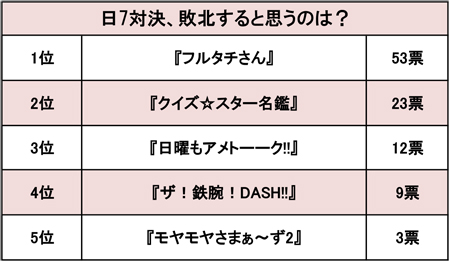 続いて9票を獲得して第4位になったのは、日本テレビ系『ザ! 鉄腕! DASH!!』。1995年にスタートし、今年で22年目に突入するご長寿番組で、安定して高視聴率をマークしており年代を問わず固定ファンも多いのだが、「番組の歴史は感じますが、マンネリ化して面白くありません。新しい企画が必要です」(70代/男性)「鉄腕ダッシュは昔から放映されていて、面白みにかけるので敗北する」(30代/男性)「TOKIOファンが見ている限り、ある程度視聴率は確保できると思いますが、マンネリ化しているので、だんだん面白みがなくなっているから敗北すると思います」(20代/男性)と、番組企画が似かよったものばかりになっているという声が一部から上がった。