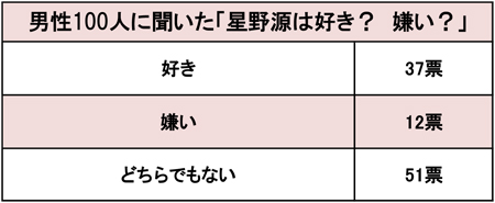 サイゾーウーマン芸能男性タレント男性に聞いた「星野源は好き?嫌い?」 芸能 サイゾーウーマン世論調査 男性100人に聞いた「星野源は好き? 嫌い?」――「調子に乗ってる」「基本がなってない」 2017/03/03 19:08 芸能ウラ情報男性タレント 2016年10月に放送されたドラマ『逃げるは恥だが役に立つ』(TBS系)で一気にブレークした星野源。主題歌に起用された「恋」は、エンディングで踊る“恋ダンス”も話題となり、見事2年連続で『NHK紅白歌合戦』出場も果たした、まさに時の人。『逃げ恥』で演じた“プロの独身”「津崎平匡」のキャラクターとクセのない顔立ちも相まってか、女性を中心に爆発的な人気ぶりを見せているが、男性陣は、果たして星野のことをどう思ってるのだろうか。そこで今回は、男性100人名に、「女性人気爆発の星野源は好き? 嫌い?」というアンケートを実施した。(Sagooooワークス調べ/調査地域:全国/調査対象:男性・年齢不問/調査期間:1月19~1月25日/有効回答数:100) 「恋」/ビクターエンタテインメント アンケートでは、「好き」が37票、「嫌い」が12票で、なんと「どちらともいえない」が約半数を占める51票という結果に。主な理由としては、 「よく知らないので、現段階では好きでも嫌いでもありません」(20代/正社員) 「好きも嫌いも、彼についての知識がゼロなので何とも言えない」(50代/正社員) 「彼について知りたいとも思わないし、どうでもいい人」(30代/正社員) 「特徴がなく普通の人なので、好きでも嫌いでもない」(30代/正社員) 「ただのブームだと思うので。ドラマは良かったが、彼に興味はない」(40代/個人事業主) など、突然人気が出た割には、個性が薄いと思われているようで、「普通の役者さんという感じで、特徴的なところがあるのかわからない。私には感じ取れない」(30代/無職)と、特に気に留めていない男性が多数。また、ドラマを見ていた男性でも 「ドラマ上での星野さんはなかなかの存在感に思えたのですが、歌を歌うときは調子に乗ってる感が否めない」(50代/無職) 「ドラマを見ていると、とても好印象だったが、歌番組を見ているとそれほど好きではない。総合的に普通」(30代/個人事業主)「ドラマは面白かったし、歌っている姿も嫌いではない。かといって好きというわけでもない」(40代/公務員) と、俳優、歌手の両面で見せるイメージの違いから「可愛らしいキャラクターだとは思うが、テレビのために作ったものかもしれない」(20代/パート・アルバイト)という素性のわからなさが、好き嫌いの判断をしかねる原因となっている様子もうかがえる。なお、同性目線ならではの意見として、 「同じ男性としては、何が魅力なのかよくわからないというのが正直なところ」(30代/会社員) 「何がそんなに人気になっているのかよくわからない。それほど二枚目でもなく、演技が抜群なわけでもなく、歌がうまいわけでもないのに」(60代/無職) といった、星野を支持する女性の気持ちを理解しかねる声も見受けられた。 次のページ 「好き」派が語る、星野源の容姿の魅力 123次のページ 関連記事 「小園凌央はオーラなし」「岡田結実は父に似すぎ」親の七光りだと思う若手二世タレントランキング「今は“痛姫”と呼ばれてるけど」20~30代女性に聞く「実はあこがれていた歌姫」ランキング「AKB48は日本の恥」東京五輪開会式に“出てほしくない”アーティストランキング「広瀬すずは性格が悪い」「高畑充希は魅力ナシ」“いい加減飽きた”若手ブレーク女優ランキング「山崎賢人はつまらない」「福士蒼汰は平凡」“いい加減飽きた”若手ブレーク俳優ランキング