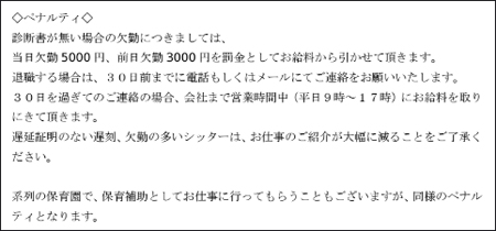サイゾーウーマンコラム角川慶子「保育園作りました」保育業界は人材確保が大変! コラム 角川慶子の「シロウトで保育園作りました」第138回 「のんびり働きたい」と音信不通、「電車が遅れたんで」と遅刻、保育業界は人材確保が大変! 2017/06/17 16:00 シロウトで保育園作りました シッター採用の際に渡すマニュアルの一部です。ペナルティの部分を追加しました。これで改善できればいいのですが……。 いやー、保育園は順調なのですが、ベビーシッターの求人で来た人の行動が謎で困っています。どう謎かというと、面接に来た人が有資格者(看護師や保育士)で、しかも感じがいい人だったので、帰られてからすぐ、たくさんの案件(「いいシッターさんが見つかったら、固定でお願いしたい」と頼まれていたお客様宅への派遣など)を連絡したら、音信不通になった人が何人もいるのです。ええええ! 仕事が少なくて辞めるならわかるのですが、その逆でしょ。確かに面接で「いままでフルタイムだから働き方を変えたくて、とりあえず登録してみようと思いました」と言っていたし、のんびり働きたかったのかもしれませんね。シッターレポートの冊子(複写式50枚)と、IDカードは高いので、仕事をしないなら送り返してきてほしいです。 森のナーサリーはバンバン仕事があるので、副業というよりは本業向きかもしれません。夜勤を月20日できれば、年齢学歴不問で、手取り50万円弱にはなるし、がっちり働きたい人にはいい仕事です。毎日新規の問い合わせが入るようになったのですが、シッターが足りない、曜日がかぶって対応できない……。苦戦しています。当欠を絶対にしない人、時間に真面目な人が最低条件ですが(当たり前!)、興味のある人はぜひ面接にお越しください。系列保育園で研修制度があります(研修期間も賃金はもらえます)! ■ベビーシッター事業とキャバクラの共通点 そうそう、前回も書きましたが、時間を守らない、当欠をする人が数人いるので、キャバクラのようにペナルティ制度を設けました(笑)。診断書のない当欠は5,000円を引きますし、「遅延証明のない遅刻、当欠をしたスタッフは、大幅に仕事が減る」とも記載しました。うちの会社の場合、シッターさんが保育補助に入ることも多いのですが、保育園なら多少遅れてもいいだろうと思うバカもいて、悪びれないのです! 普通「遅れて申し訳ございませんでした」などと最初に一言謝るじゃないですか。謝りもなしに、「電車遅れたんで」と一言言われた時は、さすがにカチンときました。遅延情報にも載っていないので、ただの遅刻だと思います。これも、1回だけではなく、当欠(30分前にメールで連絡)や度重なる遅刻があり、私もキレて、頼んでいたシフトを全キャンセルし、違うシッターに振り替えましたよ。これといって動ける人でもなく、子どもがなついている様子もないので、チェンジです。 勤務態度を改めないのに、「保育園の補助や、固定の仕事はありますか?」と連絡してくる根性は、謎の極み。固定のお仕事を紹介したら、遅刻するわ、勝手にタクシー使った挙げ句に、「〇〇さん家は自宅から遠いんで」と連絡があるわ、本当によくわからなくなりました。学歴は高いので、高学歴が好きなお宅にだけ、紹介しようと思います。ってか、こういう方は、べビーシッターより、家庭教師や塾講師の方が確実に向いているし、時給も高いですよね。まあ、娘を塾に行かせていますが、遅刻する先生や、休む先生はいないので、どこであっても通用しませんけどね。 衾の森こども園は、今年度に開園した保育園なので、6月、7月、8月、9月と園児が増えていくのですが、その中には「衾の森に入れるなら引っ越します」という方がいて、とてもうれしい気分になりました♪ 現在も渋谷や等々力から車で通ってきてくれる園児がいたり、駒沢の森こども園同様、遠方からの登園も多いです。保育園をやっていると、そんな“選んでくれた感”が、すごくうれしいんですよ。自分の娘の時は、いくら空いているからといって、とてもじゃないけど、白金台にある自宅から車で15分もかかるファミリア保育園(ファミリア プリスクール)には通う気にはなれませんでした(笑)。そもそも私は通勤30分圏内希望の人なので、近所に保育園を作った次第です。 角川慶子(かどかわ・けいこ) 1973年、東京都生まれ。「角川春樹事務所」会長・角川春樹氏の長女。自身も元アイドルという異色の肩書きに加えて、ビジュアル系バンド好きで、元バンギャルの”鬼畜ライター”としても活躍。2011年9月に認可外保育園「駒沢の森こども園」、16年4月からは派遣ベビーシッター「森のナーサリー」、17年4月に認可外保育園「衾の森こども園」をオープンさせる。家庭では9歳の愛娘の子育てに奮闘中。 最終更新:2017/06/17 16:00 手取り50万円弱ってマジなの……!!?? 関連記事 「若い」「資格あり」「経験者」でも要注意!? ベビーシッター選びは偏見だらけ!認可外保育園