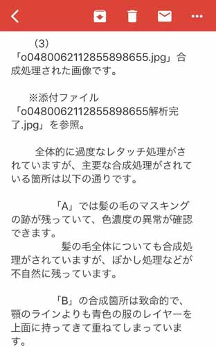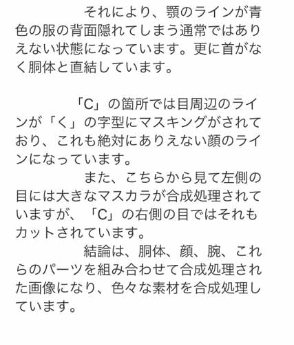 サイゾーウーマン芸能女性タレントざわちんアンチによる、“合成鑑定”第2弾 芸能 あの女たちがまた再集結!! ざわちんアンチによる、“合成鑑定”第2弾! 執念で導いた「顔ドロボー」への最終通告 2018/03/04 15:00 ジャニーズ芸能ウラ情報女性タレント 浅田真央の画像は「本来なら考えられない」現象が! 【4】 浅田真央 【結論】全体的に過度なレタッチ処理がされている。 【詳細】 ・A⇒髪の毛のマスキングの跡が残り、色濃度が異常。 ・B⇒首がなく胴体と直結している。 ⇒さらに致命的なのは、顎よりも、青色の服が上に来ているということ。これは本来ならあり得ない。 次のページ MEGBABYものまね画像はざわちんではなく「別人」 前のページ123456次のページ 関連記事 ざわちん「顔ドロボー」疑惑、プロ画像解析業者による衝撃の結果……アンチ執念の結実出雲大社で星条旗、ひめゆりの塔で「気持ちよくない」……“常識外れ”ざわちんの危険度「画像盗用」「修整」疑惑のざわちん、“好感度アップ”の方法を100人に大調査!画像無断転載、ものまねメイク加工疑惑……ざわちんの“筆跡”からわかる「炎上しやすい体質」「目頭はどうやって丸くしたの?」ざわちん、羽生結弦のものまねメイクに加工疑惑