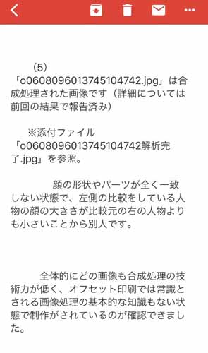 サイゾーウーマン芸能女性タレントざわちんアンチによる、“合成鑑定”第2弾 芸能 あの女たちがまた再集結!! ざわちんアンチによる、“合成鑑定”第2弾! 執念で導いた「顔ドロボー」への最終通告 2018/03/04 15:00 ジャニーズ芸能ウラ情報女性タレント MEGBABYものまね画像はざわちんではなく「別人」 【5】MEGBABY 【結論】別人。顔の形やパーツが全く一致していない。右(普段のざわちん)が、左(メークしたと思われるざわちん)よりも顔が大きい。 〇解析の総括 ・全体的にどの画像も合成処理の技術力が低い。 ・画像処理の基礎知識がない状態で作られているのが確認できる。 以上のような解析報告書が、画像と一緒に今年1月23日に届いたという。 ■幻の解析画像候補 だが実はもう1人分、解析を依頼しようとしていた画像があった。それが、ざわちんによる、羽生結弦選手のものまねメーク写真だ。だが「MiMi」によれば、意図的に画質をかなり落としてある画像のため「解析不可」と判断、残念ながら調査は見送られてしまった。だが同社のスタッフは、「これは『合成』です」と、一見しただけで見分けたという。やはりプロの目はごまかすことはできない。 そんな「MiMi」は、これまで画像の真偽をめぐる裁判で一度も負けたことがない、無敗を誇る専門業者。もちろん今回の解析結果についても、もし、ざわちん側に訴えられても「負けることはない」と相当な自信を持っているという。 偽造・合成・捏造を繰り返し、自らを偽り続ける「嘘ちん」。今回宣告された最終結果に今、何を思うのだろうか。 前のページ123456 最終更新:2018/03/04 15:00 使命に燃える女たちの戦いはいかに……!? 関連記事 ざわちん「顔ドロボー」疑惑、プロ画像解析業者による衝撃の結果……アンチ執念の結実出雲大社で星条旗、ひめゆりの塔で「気持ちよくない」……“常識外れ”ざわちんの危険度「画像盗用」「修整」疑惑のざわちん、“好感度アップ”の方法を100人に大調査!画像無断転載、ものまねメイク加工疑惑……ざわちんの“筆跡”からわかる「炎上しやすい体質」「目頭はどうやって丸くしたの?」ざわちん、羽生結弦のものまねメイクに加工疑惑 次の記事 中学受験は「親のエゴ」なのか? >