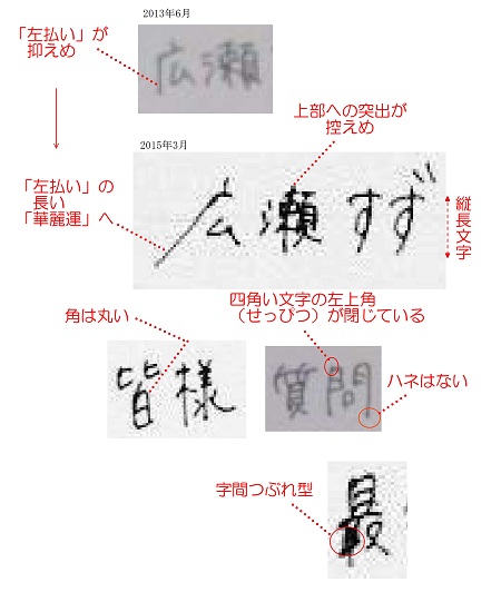 サイゾーウーマンコラム広瀬すずが世間を「ザワつかせる」ワケ コラム [THE筆跡鑑定ファイル] 広瀬すずはなぜ世間を「ザワつかせる」のか?――プロ筆跡鑑定人が指摘! 2018/03/14 15:00 女優筆跡広瀬すず 「最」「瀬」など、細かい部分がぐちゃっとつぶれるのは危険信号! ――若くして成功すると、なかなか大変ですね。 牧野 なお、前々回紹介した吉岡里帆さんも、プライベートの文字は同じような雰囲気だったと思い比較してみたところ、文字の雰囲気は似ていても、筆跡の特徴は、はっきり違っていることがわかりました。比較すると、器の大きさは断然、吉岡さんのほうが大きいでしょう。広瀬さん、要領は良さそうですが、環境によってころころ変わるタイプかもしれません。メンタルは、あまり強くなさそうな気がします。 あと、気になるのが字間つぶれ(「最」の字)が出ていることです。 ――「最」の字は、広瀬さんに限らず、結構つぶれている人がいますよね。 牧野 インクの染みであればいいのですが、心のどこかに苦しいものやストレスを抱えていると、文字の込み入った部分の線が、重なったりつぶれたりするんです。自分で「忙しいな、つらいな」と自覚していればいいのですが、「大丈夫!」と思い込んで頑張りすぎると、心身に負担をかけてしまいます。ただ、この筆跡は2015年のものですので、現在の元気な姿から、心配することはないでしょう。 ――ご自身の名字にある「瀬」もつぶれやすい文字ですが、ぜひつぶさずに書いてほしいですね。 (石徹白未亜) 牧野秀美 筆跡鑑定人。筆跡アドバイザー・マスター。筆跡心理学をもとにした鑑定と診断を行う。著書に『自分のイヤなところは直る! 〜名前を書くだけ〜』(東邦出版) ・ほっかいどう筆跡鑑定研究所 前のページ12 最終更新:2018/03/14 15:00 筆跡も変わるのね 関連記事 羽生結弦の強さは文字にも表れていた! 冷静沈着な情熱家の素顔を、プロ筆跡鑑定人が解説吉岡里帆はなぜ「ウザい」のか? アンチを刺激する理由を、プロ筆跡鑑定人が指摘!竹内涼真は「あざとい」のか? 真のぶりっこ度&ナルシスト度を、筆跡から読み解く!浜崎あゆみが画像修正するワケ――「自分や時代の変化に気づいている」とプロ筆跡鑑定人が指摘!画像無断転載、ものまねメイク加工疑惑……ざわちんの“筆跡”からわかる「炎上しやすい体質」 次の記事 堀田茜の過剰な「潔癖アピール」に批判 >