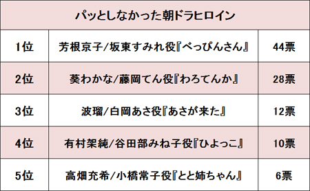 サイゾーウーマン芸能女性タレントパッとしなかった朝ドラヒロイン 芸能 サイゾーウーマン世論調査 『わろてんか』葵わかなは「関西弁が変」「笑顔がヘタ」!? パッとしなかった朝ドラヒロインランキング 2018/03/30 17:50 芸能ウラ情報女性タレント 昭和30年代から、実に57年にわたって放送されているNHKのテレビドラマシリーズ「連続テレビ小説」。主演を務める女優は“朝ドラヒロイン”として注目を集めるため、スターへの登竜門ともいわれているが、中には「印象に残らなかった」「役とのイメージに合ってなかった」などと、いまいちブレークできずに終わってしまったヒロインも。そこで今回、男女100人にアンケートを行い、近年、朝ドラヒロインを務めた女優でパッとしなかった女優と、その理由を聞いてみた。(調査地域:全国/調査対象:年齢不問・男女/調査期間:2018年02月08日~2018年02月22日/有効回答数:100サンプル) 『わろてんか』(NHK)公式サイトより 1位は『べっぴんさん』(2016年度後期)で、子ども用品店「キアリス」の創業者・坂東すみれ役を演じた芳根京子で44票。デビューから3年にして、2,200人を超える中からオーディションで選ばれた芳根は、業界内で演技力に定評のある若手だが…… 「良くも悪くも印象が薄い女優さん。特徴がないので、ただのいい子ちゃん止まりになっている」(43歳/女性) 「あまり派手な顔立ちでないことと、作品のストーリーや演じたキャラクターもなんだかこぢんまりとしていて、パッとしない印象」(51歳/男性) 「これといってきれいでもなく、演技が秀でてうまいわけでもなく、“パッとしない”を絵に描いたような人」(46歳/男性) と、役柄と芳根のイメージが相まって、無難な印象に留まってしまった様子。 朝ドラ終了後は、ドラマ『モンタージュ三億円事件奇譚』(フジテレビ系)や、映画『心が叫びたがってるんだ。』でヒロインを務め、先日最終回を迎えた月9『海月姫』(フジテレビ系)にも出演していたのだが、「朝ドラヒロインのわりにはあまり話題にならず、ブレークしていない印象が強い」(28歳/女性)「朝ドラを演じた後、あまり活躍している姿を見かけていない」(35歳/男性)と、やはり記憶には残らなかったようだ。 とはいえ、「シナリオが面白くなく、娘の反抗期など気持ちが暗くなる週が続いたので、ヒロイン自体の魅力も下がってしまっていた」(33歳/女性)「戦争という激動の時代に生きたわりには、何が何でも成功してやるという覇気が感じられず、流されっぱなしのところが面白くなかった」(39歳/男性)と、「ドラマの内容がつまらないとヒロインも悪い影響を受ける」(46歳/男性)と脚本に難があったとする人も少なくなかったよう。「存在感という意味でパッとしなかったが、まだまだ新人だから、これから多くの作品に出ることで違ってくるのだと思う」(39歳/女性)と、今後の成長に期待する声も散見された。 次のページ 葵わかなは脇役に食われてしまった!? 123次のページ 関連記事 「ハレンチ写真に驚愕」「政治家の自覚なし」最もエグい不倫騒動を起こしたタレントランキング「相葉は個性がない」「大野は仕事が嫌いそう」嵐の中で“先がない”と思うメンバーランキング「桐谷美玲の内臓はどこ?」「戸田恵梨香は覇気がない」痩せすぎだと思う女性タレントランキング「クリスは押しが強い」「ミッツは毒吐きすぎ」実は苦手な“人気オネエタレント”ランキング「マギーは特徴ない」「ダレノガレは柄が悪い」いち早く消えそうな“ハーフタレント”ランキング