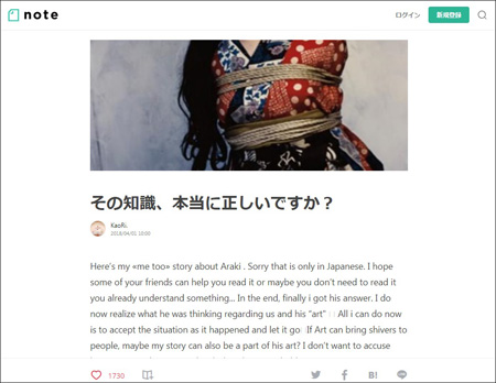 サイゾーウーマンカルチャーインタビューアラーキー告発、なぜモデルは弱い立場? カルチャー 「#MeToo」告発 アラーキー告発で「モデルの弱い立場」浮き彫りに――業界のセクハラ横行が問題視されにくい理由 2018/04/11 17:00 インタビュー KaoRi氏noteより 世界的に有名な写真家・アラーキーこと荒木経惟氏の“元ミューズ”であるKaoRi氏が、ソーシャルメディアプラットフォーム「note」に「その知識、本当に正しいですか?」というタイトルで、荒木氏への告発文を掲載し、世間の関心を集めている。 KaoRi氏は、荒木氏の被写体を務めていた2001~16年にさまざまな苦痛を経験したといい、その詳細を一つひとつ綴っているが、そもそも最初に違和感を覚えたのは、契約書がなかった点だったようだ。KaoRi氏いわく「それまで海外で一緒に活動したフォトグラファーたちは毎回、撮影同意書があり(中略)出版する場合にもその度ごとに同意書や内容確認が求められていました。ロイヤリティーに関して記載があるものもありました」とのことだが、一方で荒木氏とはこういった契約を一切結ばなかったという。 それが影響してか、「撮った写真は、事前の報告もなく、いつの間にか私の名前をタイトルにした写真集やDVDにもなり出版され、世界中で展示販売されてゆきました」「撮影は、報酬を得ていたこともありましたが、パフォーマンスなど、無報酬のことも多々ありました」といった事態に発展。 また荒木氏に「『ミステリアスで、なんでもする女』というようなイメージを公に晒されたことによって、日常生活は長い間、ストーカー被害に悩まされ」るなど、KaoRi氏の日常はどんどん蝕まれ、「あまりのストレスに、街中や飛行機の中で意識を失って倒れたことや、目を閉じたら殺されているかもしれないと身の危険を感じた日も少なくありませんでした」と当時を振り返っている。 こうしたKaoRi氏の告発には、「モデルの地位はなぜこれほどまでに低いのか?」「モデルは写真家に搾取されるだけの存在に見えてしまう」といった指摘が出ているが、その背景について、弁護士法人ALG&Associatesの山岸純弁護士が次のように解説してくれた。 次のページ モデルは“被写体”という扱い 123次のページ 関連記事 はあちゅうの“セクハラおじさん告発”に見る、「結局は自分にしか興味がない」人物像加藤綾子アナの“Eカップイジり”に「テレビ界は異常」の声――「セクハラ炎上」多発のフジ元乃木坂46・橋本奈々未、「引退原因」に黒いウワサ……芸能プロ役員からの「セクハラ被害」!?介護現場でセクハラが多い理由 見て見ぬ振りをされた高齢者の性ジャニーズ「ホモセクハラ告発」の変遷、『紅白』とSMAPの力関係……驚愕のマスコミ制御術