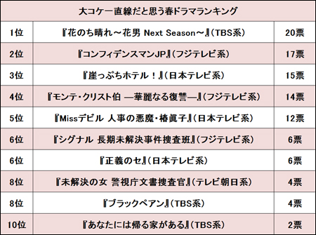 サイゾーウーマン芸能テレビ大コケと思う春ドラマランキング 芸能 サイゾーウーマン世論調査 「『花のち晴れ』は前作に劣る」「月9の長澤まさみは旬過ぎた」大コケ一直線だと思う春ドラマランキング 2018/05/01 19:30 テレビ芸能ウラ情報 4月、続々とスタートを切った2018年の春ドラマ。5月に入り、勝ち組ドラマと負け組ドラマに明暗が分かれつつあるが、どれも今後の展開が気になるところである。そこで今回、男女100人に、「大コケ一直線の春ドラマ」を予測してもらった。 『花のち晴れ~花男 Next Season~』(TBS系)公式サイトより 1位は『花のち晴れ~花男 Next Season~』(TBS系、火曜午後10時)で20票。杉咲花とKing&Prince・平野紫耀とがタッグを組んだ同作は、社会現象を巻き起こした『花より男子』(同)のネクストシーズンとして注目を集めてスタートしたが、初回から7.4%(ビデオリサーチ調べ、関東地区/以下同)という体たらく。「『花より男子』の続編ということで期待値が高い分、コケる可能性が高いと思う」(30代/女性/正社員)との見方が大半という結果に。 というのも、「あの『花男』の続編なのに、キャストに魅力がない。主人公役の女の子はまだゴールデンタイムの主役を演じるには早いような……」(20代/女性/学生)「『花より男子』のドラマに出演していた女優や俳優陣に比べてキャストが劣る感じに見える」(30代/男性/パート・アルバイト)など、前作のイメージが強すぎて「出演者にあまり魅力を感じない。脚本家があまり面白くなさそう」(50代/男性/個人事業主)と感じてしまった人が多かったよう。 2位は『コンフィデンスマンJP』(フジテレビ系、月曜午後9時)で17票。主人公を演じる長澤まさみは、連ドラ主演6年ぶり、月9に至っては『プロポーズ大作戦』以来11年ぶりとあって、鳴り物入りでスタートを迎えたものの、初回視聴率9.4%と思いのほか伸びなかった。この点に関しては、「出演者や内容以前に、月9という枠が長らく空回りしているように感じる」(20代/女性/学生)という意見が上がっている。 また、長澤についても苦言が。フジとしては“長澤主演”の話題性に賭けたのだろうが、視聴者の中には「長澤まさみはきれいだが、もうすでに旬は過ぎていて、ほかの俳優が見たいと思っている人が多そう」(30代/女性/専業主婦)「個人的に嫌いではないが、長澤まさみさんはブームが去っているので苦しいと思う」(40代/男性/個人事業主)と感じている者もいる様子。「今のフジテレビは何をやってもうまくいかないだろう。根本的に時代とずれている」(40代/男性/正社員)との印象を強めてしまっただけのようだ。 3位は15票で『崖っぷちホテル!』(日本テレビ系、日曜午後10時30分)。三代目J Soul Brothers・岩田剛典が初の連ドラ主演を務めているが、視聴率は初回2ケタ越えを果たすも、第2話からは6%台に低迷中だ。「正直、EXILEグループの演技力の低さは救いようがないと思っている」(20代/女性/専業主婦)「主演の人の演技がうまくないから、見ていて白けてしまいそう」(40代/女性/派遣社員)と、演技力への期待薄が、爆死につながった模様。さらに日曜深夜という時間帯も相まって、「時間帯が微妙だし出演者もパッとせず、魅力を感じない」(20代/女性/正社員)との結論に達したという声もあった。 1票差の14票で4位となったのは、『モンテ・クリスト伯 ―華麗なる復讐―』(フジテレビ系、木曜午後10時)。19世紀のフランス小説『モンテ・クリスト伯』が原作とあって、「『モンテ・クリスト伯』は本で読んでこそ良さが味わえる。ドラマという限られた時間では、その素晴らしさは十分に伝わらない」(20代/男性/学生)と難色を示す声が。また、ディーン・フジオカが主演を務めていることに対し、「ディーン・フジオカさんは好きだが、少し荷が重そうに感じる」(50代/女性/個人事業主)「ディーン・フジオカの演技は主演向きではないと思う。朝ドラではピンポイントでの出演だからウケただけで、決して実力があるとは言えない。復讐モノは外さないとはいえ、厳しいのではないか」(30代/女性/派遣社員)と見る向きが強いようだ。事実、初回から5.1%の大爆死を喫してしまった。 次のページ 菜々緒に人気があるとは思えない 123次のページ 関連記事 「石田ゆり子は褒められすぎ」「篠原涼子はおバカキャラ」過大評価されすぎなオトナ女子ランキング『わろてんか』葵わかなは「関西弁が変」「笑顔がヘタ」!? パッとしなかった朝ドラヒロインランキング「ハレンチ写真に驚愕」「政治家の自覚なし」最もエグい不倫騒動を起こしたタレントランキング「今は“痛姫”と呼ばれてるけど」20~30代女性に聞く「実はあこがれていた歌姫」ランキング「『ルパン三世』は人が死にすぎ」実写化しなくてもよかった2010年代映画ランキング