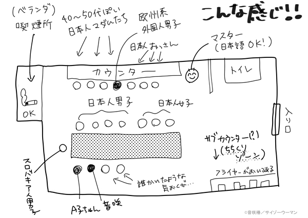 新しいお客さんが来た! 外国人か!? ……と思ったら20〜30代くらいの日本人男性3人グループ。日本人男性も外国人女性との出会いを求めてるのね。でも私は、こういう場所に外国人女性がいるのをまず見たことがない……。彼らは20代女子グループの横の席に座り、何やら会話をし始めたもよう。