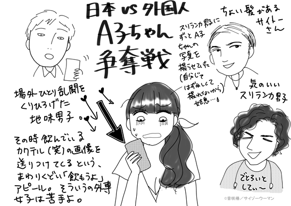 サイゾーウーマンコラム日本男子のダメすぎる口説き方 コラム [連載]イケメン探して世界一周! “外専女子”なオンナたち -011- 「英会話カフェ」で意外なバトル!? 外専女子が見た、ダメ日本男子の「そういうとこだぞ」 2018/08/14 19:00 音咲椿“外専女子”なオンナたち外国人 翌日…A子ちゃんに起きた”悲劇” 翌日、A子ちゃんが 「スリランカ人の彼と食事に行く約束しました〜。ところであいつ! あいつですよ! すっごくしつこいんです!」 と言うので、てっきり斎藤さんだと思ってたら……あの印象薄い、地味日本人男子‼︎ いつの間にLINEのID交換してたんだ!! A子ちゃんが彼とのLINEのスクショを見せてくれたのですが、背筋がゾッとしました。 実は、A子ちゃんには在日外国人の彼氏がいるんですが、そのことを地味男子にハッキリと何度伝えても、ひるむことなく「週末にデートしてくれ」としつこく誘っている。あの場ではほぼ何も話せていなかったのに、LINEトークでネチネチと粘着質にアタックとは……。 英会話カフェに集う日本人男性は、てっきり外国人女性との出会いを求めて来ているのかと思っていたのですが、一部には「外国人男性のおこぼれ」にあずかろうとする「ハイエナ日本人男子」が存在するようです。 (作者取材の為、しばらく不定期更新となります) <著者プロフィール> 音咲椿(おとさき・つばき) 男性向けグラビア誌編集長を経て、ポット出版社刊「女の子×女の子のためのエロチックブック・Carmilla」にてイラスト・漫画家デビュー。 単行本「イケメン外国人たちとベッドで異文化交流した結果。」(ぶんか社刊)好評発売・配信中。 マンガ最新作「『こんな大きいなんて聞いてない!』~外国人と異文化SEX、ヤりまくりました。」が、電子コミックサイト「ComicFesta」より配信開始されました! 各電子書店にて順次公開予定です。https://comic.iowl.jp/titles/71014/volumes/empty 前のページ12 最終更新:2019/05/21 18:39 日本男子の際立つ粘着っぷり… 関連記事 外国人男性とのセックス、9割の女子が「興味アリ」!? 6カ国の男とヤッた体験話します!「わたしの真似はしないでください」外専女子がイケメン外国人たちとベッドで異文化交流した結果アソコの毛は「全剃り」すべき? ドイツ語講師のフリードリヒと初デートで起きた“障壁”イケメンはどこに消えた!? 場末のスナックで泥酔する“小太りオージー”と悪夢の一夜「外国人バー」で捨て身のナンパ大作戦!? オーストラリアの英語講師とカラオケで運命の出会い 次の記事 データから見る児童虐待の現実 >
