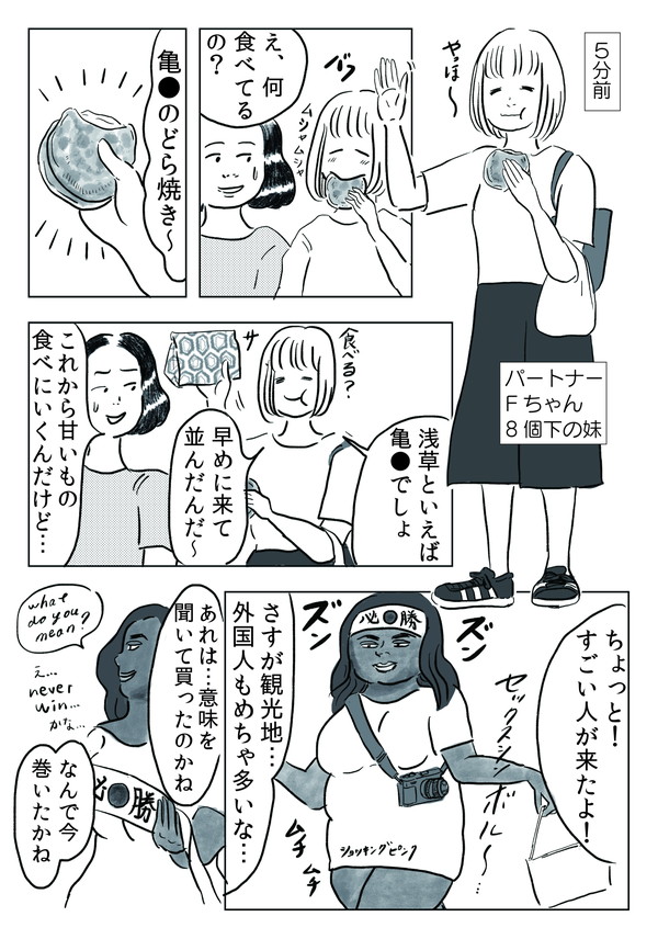 サイゾーウーマン【漫画】浅草をディグる(1) カルチャー 【マンガ連載】のがみもゆこの『東京をディグる』 【マンガ】「ケーサツ呼ぶよ!」怒れる老婆、浮かれる外国人……観光名所・浅草を見つめ直してみようか【東京をディグる・8話】 2018/10/03 18:00 マンガのがみもゆこのがみもゆこの『東京をディグる』 東京の下町には、酒とサウナとへんなおじさんが吹き溜まる――…。 荒川周辺に暮らすアラサー漫画家・のがみもゆこが 独特の視点で下町のあれやこれやを掘り下げる、ぶらぶらお散歩たのしいルポエッセイ。 水曜の夕方を亜空間へいざなう、へんなおじさんワールドへようこそ! 老婆、激しい怒りのポーズ (次回につづく) ――毎週水曜日に、最新話を更新。次回は10月10日(水)更新予定です。 のがみ・もゆこ 1985年茨城生まれ。日本大学芸術学部デザイン学科卒。 茨城の高校でデザイン・映像メディア専攻の非常勤講師をしつつ 個展、グループ展、WEBにてイラストレーションやエッセイマンガを発表しています。 Twitter:https://twitter.com/mogaminoyuko Instagram:https://www.instagram.com/mogaminoyuko note:https://note.mu/nogami_moyuko HP:https://mogaminoyuko.tumblr.com <『東京をディグる』バックナンバーはこちら> 【第1章】南千住・三ノ輪をディグる 最終更新:2019/05/24 16:08 とんだ誤訳だぜ! 関連記事 【婚約破棄マンガ】これが「毒親」のコントロール!? 1対3での”ムチャクチャな罵倒”についていけない!【第6回】【婚約破棄マンガ】優しい彼が「まるで別人」!? 同居に反対してたハズなのにどうして!【第5回】【マンガ】2ショット撮影、○○の手渡し……アイドル活動をしている推しが尊すぎてヤバイ!【2.5次元の推しゴト!!】【配信者マンガ】視聴者からの「サプライズ」で届いたモノは……度が過ぎるイタズラにドン引き!【第3回】【タイ移住マンガ】転職活動と「ヒミツの趣味」!? タイと日本、遠距離恋愛のいいところ【6話】 その他の作品を読む 次の記事 とんねるず、FC解散は「終活」? >