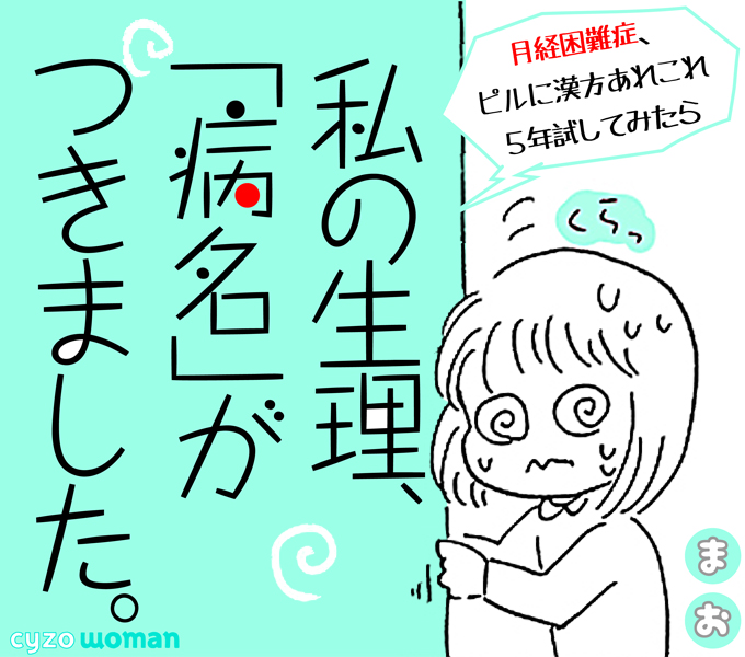 サイゾーウーマンカルチャーマンガ【新連載】私の生理、ビョーキでした!? カルチャー 【連載】私の生理、「病名」がつきました。~月経困難症、ピルに漢方あれこれ5年試してみたら~ 【マンガ】私の生理、「病名」がつきました。~月経困難症、ピルに漢方あれこれ5年試してみたら~【新連載】 2018/12/02 18:00 マンガ私の生理、「病名」がつきました。月経困難症 「生理痛なんて、みんな一緒!」 1カ月ごとにやってくる、尋常じゃない腹痛・寒気・吐き気……。 周囲の言葉を信じて10数年も耐え続けた「生理痛」、医者にかかってみたらビョーキと診断されちゃった!? 30歳から治療を開始した「月経困難症」との向き合い方をつづる、日常闘病コミックエッセイ。 はじめまして ※株式会社ツムラ公式サイト「月経困難症・月経痛」より引用 次のページ 「倒れるのが普通」なの? 12次のページ 関連記事 【育児マンガ】産後あるある! 「いっぱい出たね」は幼児だけの事象じゃない……!【第4回】【マンガ】「気功のおやじ」と26年越しの再会! 雑居ビルで受けた施術は……【東京をディグる・14話】【婚約破棄マンガ】「家に行く」って冗談でしょ!? アレを忘れる彼の「自覚の無さ」にブチギレ!【第21回】【配信者マンガ】パンスト被って電車、○○で渋谷徘徊……「BAN常習配信者」の日常がヤバイ!【第9回】【タイ移住マンガ】資本金で100万バーツ、ひとり雇って200万バーツ!? タイ起業の豆知識!【13話】 その他の作品を読む