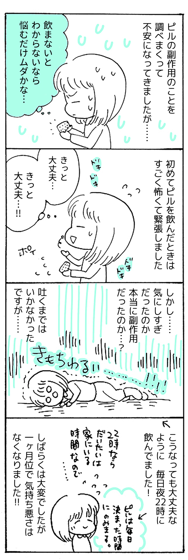 サイゾーウーマンカルチャーマンガ【9回】ピル飲み始めはこうなった! カルチャー 【連載】私の生理、「病名」がつきました。~月経困難症、ピルに漢方あれこれ5年試してみたら~ 【マンガ】ピルを飲み始めたら「こうなった」! 最初に作ったマイルールは……【第9回】 2018/12/18 18:00 マンガ私の生理、「病名」がつきました。月経困難症 「生理痛なんて、みんな一緒!」 1カ月ごとにやってくる、尋常じゃない腹痛・寒気・吐き気……。 周囲の言葉を信じて10数年も耐え続けた「生理痛」、医者にかかってみたらビョーキと診断されちゃった!? 30歳から治療を開始した「月経困難症」との向き合い方をつづる、日常闘病コミックエッセイ。 ピル、飲み始めはこうなった! (つづく) ――「私の生理、病名がつきました。」は、毎週日・月・火の週3回更新になります。お楽しみに! <著者プロフィール> まお 月経困難症。体験した事や思った事を4コマ漫画にしています。自分の体、大切な人の体を考える事や、行動する事のきっかけになればうれしいです。ポジティブに生きてるオタク。 <バックナンバーはこちら> 【第1回】私の生理、ビョーキでした!? 【第2回】「生理で病院」を後回しにしていたら 【第3回】恥ずかしすぎる「例のイス」 【第4回】私のアソコ、何が入ってるの!? 【第5回】「子ども生みたい? 結婚してる?」 【第6回】月経困難症、はじめてのピル! 【第7回】「避妊薬」じゃないピル 【第8回】「ピルの副作用」って? 最終更新:2018/12/18 18:03 つわりみたいになるってね 関連記事 【婚約破棄マンガ】突然カネが送られてきた!? 実家に届いた「カンチガイ誠意」にイライラ!【第27回】【マンガ】「ピルの副作用」って何が起きるの? 血栓症のコワ~イ症状!【第8回】【マンガ】バングラデシュのお国柄!? 中華料理屋・マイクさんのヤバすぎる行動!【お酒がやめられない・17回】【配信者マンガ】○○現場を生配信、そして全国ニュースへーー「前代未聞」のアイドル活動!【第12回】【マンガ】ふっくらタイ移住まんが~ブラック企業を辞めたらバンコクでした~【起業編・まとめ読み】 その他の作品を読む 次の記事 KinKi・剛、「なにわ男子」に同情 >