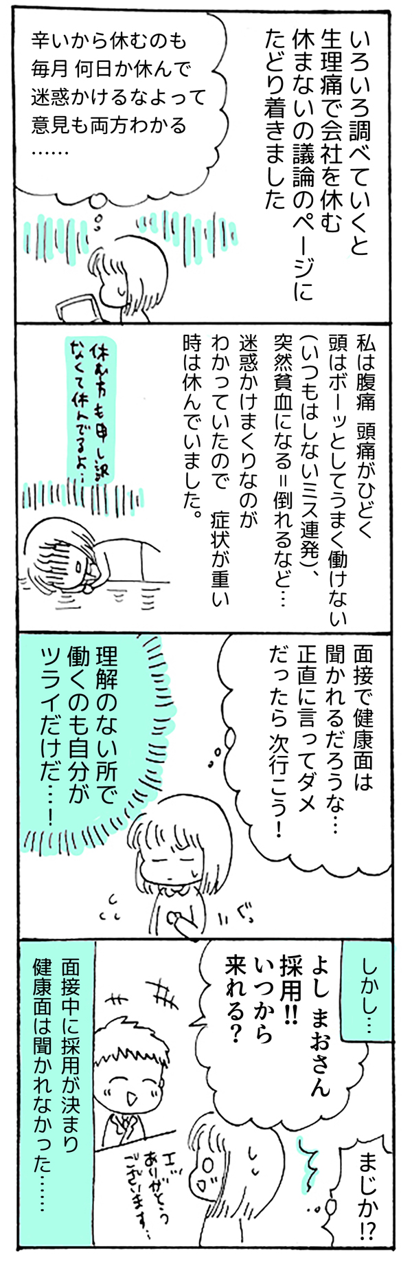 サイゾーウーマンカルチャーマンガ【13回】生理痛で欠勤すること カルチャー 【連載】私の生理、「病名」がつきました。~月経困難症、ピルに漢方あれこれ5年試してみたら~ 【マンガ】生理痛で欠勤! 迷惑なのはわかってるけど……正直に伝えてみた結果【第13回】 2018/12/30 18:00 マンガ私の生理、「病名」がつきました。月経困難症 「生理痛なんて、みんな一緒!」 1カ月ごとにやってくる、尋常じゃない腹痛・寒気・吐き気……。 周囲の言葉を信じて10数年も耐え続けた「生理痛」、医者にかかってみたらビョーキと診断されちゃった!? 30歳から治療を開始した「月経困難症」との向き合い方をつづる、日常闘病コミックエッセイ。 休む側の意見、休まれる側の意見 (つづく) ――「私の生理、病名がつきました。」は、毎週日・月・火の週3回更新になります。お楽しみに! <著者プロフィール> まお 月経困難症。体験した事や思った事を4コマ漫画にしています。自分の体、大切な人の体を考える事や、行動する事のきっかけになればうれしいです。ポジティブに生きてるオタク。 <バックナンバーはこちら> 【第1回】私の生理、ビョーキでした!? 【第2回】「生理で病院」を後回しにしていたら 【第3回】恥ずかしすぎる「例のイス」 【第4回】私のアソコ、何が入ってるの!? 【第5回】「子ども生みたい? 結婚してる?」 【第6回】月経困難症、はじめてのピル! 【第7回】「避妊薬」じゃないピル 【第8回】「ピルの副作用」って? 【第9回】ピルを飲み始めたら「こうなった」! 【第10回】2週間も「血が流れっぱなし」!? 【第11回】「ピルを飲む時間」は結構シビア 【第12回】「月経困難症+就職」で検索してみたら 最終更新:2018/12/30 18:00 生理休暇って、ちゃんと取れてる人どれくらいなんだろ 関連記事 【マンガ】バイト先で「使えない」と言われ数カ月……マイクさんの心情は【お酒がやめられない・18回】【配信者マンガ】「ガチ凶器」が家に届いたらどうする!? 対処の仕方それぞれ【第13回】【タイ移住マンガ】パスポート、腹巻、貴重品! はじめての国外脱出に緊張したものの【17話】【マンガ・ヤリマン引退】「おっぱい」が気になるお年頃! 子どもの興味を引きたくて……【第12回】【マンガ・ヤリマン引退】「ママ、ちんちんない」――幼児の疑問に、ヤリママはこう答えた!【第11回】 その他の作品を読む 次の記事 2018テーマパーク業界4大トピック >
