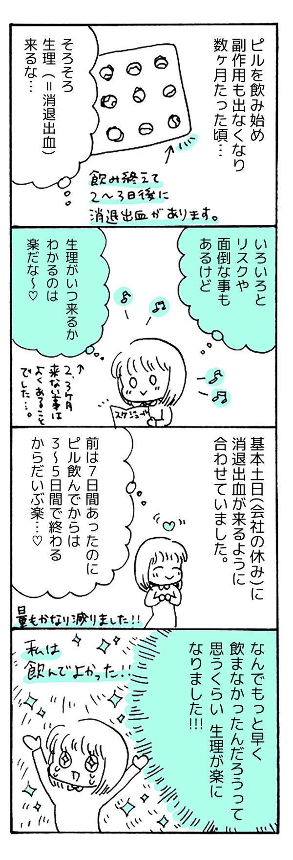 サイゾーウーマンカルチャーマンガ【14回】ピルを飲んで、どうなった? カルチャー 【連載】私の生理、「病名」がつきました。~月経困難症、ピルに漢方あれこれ5年試してみたら~ 【マンガ】ピルを飲んで数カ月……「つらい生理」はどうなった? 経験者は語る【第14回】 2018/12/31 18:00 マンガ私の生理、「病名」がつきました。月経困難症 「生理痛なんて、みんな一緒!」 1カ月ごとにやってくる、尋常じゃない腹痛・寒気・吐き気……。 周囲の言葉を信じて10数年も耐え続けた「生理痛」、医者にかかってみたらビョーキと診断されちゃった!? 30歳から治療を開始した「月経困難症」との向き合い方をつづる、日常闘病コミックエッセイ。 ピルを飲んで、数カ月たちました (つづく) ――元日更新分は、第1回~第10回までのまとめ読みとなります。来年もご愛読、よろしくお願いいたします! <著者プロフィール> まお 月経困難症。体験した事や思った事を4コマ漫画にしています。自分の体、大切な人の体を考える事や、行動する事のきっかけになればうれしいです。ポジティブに生きてるオタク。 <バックナンバーはこちら> 【第1回】私の生理、ビョーキでした!? 【第2回】「生理で病院」を後回しにしていたら 【第3回】恥ずかしすぎる「例のイス」 【第4回】私のアソコ、何が入ってるの!? 【第5回】「子ども生みたい? 結婚してる?」 【第6回】月経困難症、はじめてのピル! 【第7回】「避妊薬」じゃないピル 【第8回】「ピルの副作用」って? 【第9回】ピルを飲み始めたら「こうなった」! 【第10回】2週間も「血が流れっぱなし」!? 【第11回】「ピルを飲む時間」は結構シビア 【第12回】「月経困難症+就職」で検索してみたら 【第13回】生理痛で欠勤、正直に言ってみた 最終更新:2018/12/31 18:00 今年も1年、ありがとうございました! 関連記事 【マンガ】バイト先で「使えない」と言われ数カ月……マイクさんの心情は【お酒がやめられない・18回】【配信者マンガ】「ガチ凶器」が家に届いたらどうする!? 対処の仕方それぞれ【第13回】【タイ移住マンガ】パスポート、腹巻、貴重品! はじめての国外脱出に緊張したものの【17話】【マンガ・ヤリマン引退】「おっぱい」が気になるお年頃! 子どもの興味を引きたくて……【第12回】【マンガ・ヤリマン引退】「ママ、ちんちんない」――幼児の疑問に、ヤリママはこう答えた!【第11回】 その他の作品を読む 次の記事 ストリッパーの過去を捨てた部屋 >