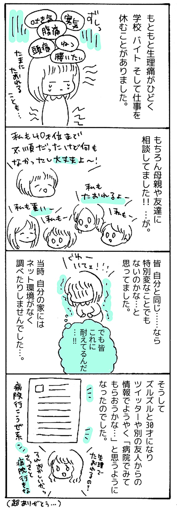 サイゾーウーマンカルチャーマンガ【1~10回】月経困難症マンガ カルチャー 【連載】私の生理、「病名」がつきました。~月経困難症、ピルに漢方あれこれ5年試してみたら~ 【マンガ】私の生理、「病名」がつきました。【第1回~第10回まとめ読み】 2019/01/01 17:30 私の生理、「病名」がつきました。月経困難症マンガ 「生理痛なんて、みんな一緒!」 1カ月ごとにやってくる、尋常じゃない腹痛・寒気・吐き気……。 周囲の言葉を信じて10数年も耐え続けた「生理痛」、医者にかかってみたらビョーキと診断されちゃった!? 30歳から治療を開始した「月経困難症」との向き合い方をつづる、日常闘病コミックエッセイ。 私の生理、ビョーキでした!? 次のページ 病院に行くのを後回しにしていたら… 123456次のページ 関連記事 【マンガ】バイト先で「使えない」と言われ数カ月……マイクさんの心情は【お酒がやめられない・18回】【配信者マンガ】「ガチ凶器」が家に届いたらどうする!? 対処の仕方それぞれ【第13回】【タイ移住マンガ】パスポート、腹巻、貴重品! はじめての国外脱出に緊張したものの【17話】【マンガ・ヤリマン引退】「おっぱい」が気になるお年頃! 子どもの興味を引きたくて……【第12回】【マンガ・ヤリマン引退】「ママ、ちんちんない」――幼児の疑問に、ヤリママはこう答えた!【第11回】 その他の作品を読む