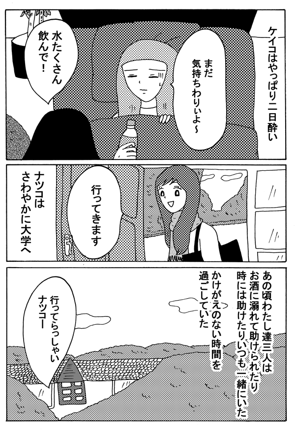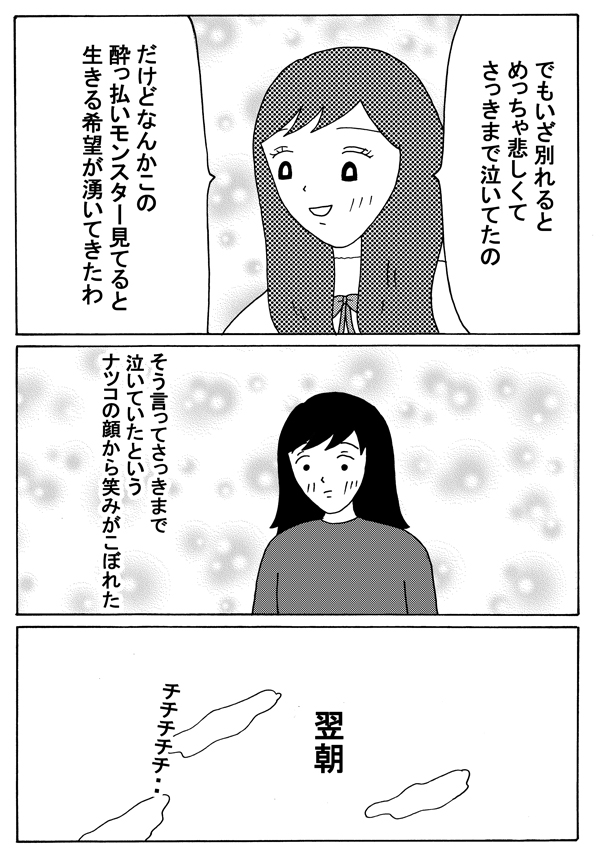 サイゾーウーマンカルチャーマンガ緑丘まこ『30代独女、それでもお酒がやめられない』【21回】謎のイケメン交えたトラブル カルチャー 【連載】「30代独女、それでもお酒がやめられない」(緑丘まこ) 【マンガ】デキる女子ほど泥酔するとヤバイ!? 謎のイケメン交えトラブル勃発!【21回】 2019/01/26 18:00 マンガ緑丘まこ30代独女、それでもお酒がやめられない このモンスターを見てると ――「30代独女、それでもお酒がやめられない」次回の更新は2月9日(土)になります。お楽しみに! 緑丘まこ(みどりおか・まこ) 兵庫県育ちの30代独女。漫画とゲームとお酒をこよなく愛する。 センベロ居酒屋やレトロなレストランを発掘するのが休日の楽しみ。 お酒は最高の友達。 Twitter note 【バックナンバーはこちらから】 (第1回はこちら:酒飲みの聖地・赤羽に、女ひとりでやってきたのだ) (第2回はこちら:赤羽のユミコさんに見た「酔っぱらいの法則」) (第3回はこちら:渋谷のコインロッカーに挟まれた三十路の夜) (第4回はこちら:安ワインが招いた“三日酔い”と血染めバスタブのゆくえ) (第5回はこちら:新幹線でエンドレス泥酔の旅) (第6回はこちら:手みやげ片手に密着警察24時) (第7回はこちら:”魅惑のタダ酒”で酩酊した結果) (第8回はこちら:目覚めたら美女とキス!?) (第9回はこちら:忘れられない”初体験”) (第10回はこちら:初めての夏、”アイツ”は突然やってきた) (第11回はこちら:親友ケイコが”ヤル気”になった夜) (第12回はこちら:支離滅裂な思考と「逆ナン」の夜) (第13回はこちら:上野でせんべろ昼飲みツアー) (第14回はこちら:泥酔した翌朝に知る「自分」のヤバイ行動) (第15回はこちら:新幹線で朝酒、トロッコ列車で昼酒!) (第16回はこちら:熊と地ビールと尿意) (第17回はこちら:バングラデシュのマイクさん) (第18回はこちら:「使えない」と言われるマイクさん) (第19回はこちら:マイクさんが見せた”凄い特技”) (第20回はこちら:ケイコの泥酔事件簿) 前のページ12345 最終更新:2019/01/26 18:00 ヤレると思ったイケメンもかわいそうに 関連記事 【マンガ・ヤリマン引退】セックス後、「マンを拭いてくれる男」には気をつけろ!【第20回】【マンガ】生理痛でセカンドオピニオン! ちょっと居づらい「婦人科あるある」【第22回】【婚約破棄マンガ】「慰謝料」どころの話じゃない! 金も弁護士も頼れない、そんな時に……?【第34回】【マンガ】ピル中止から、2度目の生理……まさかの「地獄」がやってきた!【第21回】【配信者マンガ】「殺人犯の元カノ」と生電話!? マスコミより早い「座間事件」ウラ話【第16回】 その他の作品を読むバックナンバーを読む 次の記事 『イノセンス』新鮮味ないと不満の声 >