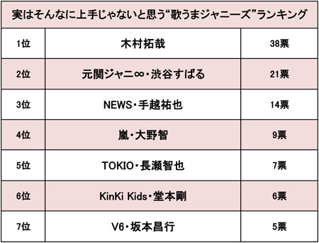 サイゾーウーマン男性アイドルSTARTO(旧ジャニーズ)「歌うま」に疑問抱くジャニーズランキング 男性アイドル サイゾーウーマン世論調査 「木村拓哉は自分に酔ってる」実はそんなに上手じゃないと思う“歌うまジャニーズ”ランキング 2019/02/03 15:00 ジャニーズ木村拓哉渋谷すばる 一口に“ジャニーズ”と言っても、人それぞれ「顔が抜群にカッコいい」「芝居がうまい」「ダンスが上手」「トークが面白い」など、さまざまな特徴を持っているものである。中には「歌がうまい」と評判のジャニーズアイドルもいるが、その半面「実は言うほど上手じゃない」「なぜ歌がうまいアイドル扱いされてるのか?」と言われてしまう人物もいる。そこで今回、男女100人に、「実はそんなに上手じゃないと思う“歌うまジャニーズ”(元含む)」は誰か、意見を聞いてみた。 「これぞ木村拓哉」という歌い方なんだよ! 1位は38票を獲得した、木村拓哉。SMAP解散後に、ソロCDデビューのウワサが持ち上がるなど、その歌唱力の高さは広く知られるところだが、 「上手そうな雰囲気を出しているけど、声量もなく、あまりうまいと感じたことがない。声も魅力的でなく、聞き応えがない」(30代/女性/正社員) 「歌がうまいわけではないと思う。何だか、歌い方からしても『俺歌うまいでしょ』というのを雰囲気で押しつけている感じがする。自分に酔っている感じ」(30代/女性/パート・アルバイト) 「かっこつけて、わざとらしく歌っているだけで、歌唱力はないと思う。実力に見合った歌い方をしてほしい」(20代/女性/無職) など、“雰囲気イケメン”ならぬ“雰囲気歌うま”と見る向きが圧倒的。「顔やダンスなどビジュアルが見えないラジオで聞くとヘタ」(50代/男性/正社員)との声もあり、声以外の部分で、歌がうまそうに見せているだけと感じていた人が多いようだ。 また、「SMAPの中では上手な方だったが、世間的には普通のカラオケレベル」(30代/女性/専業主婦)「ほかのメンバーがヘタだからうまく聞こえるが、実際はそんなにうまくないと思う」(20代/男性/パート・アルバイト)など、「SMAPのほかのメンバーがうまくないので、相対的にうまく聞こえるだけ」(40代/女性/正社員)という意見も多く聞かれた。 2位は、昨年、関ジャニ∞を脱退、ジャニーズからも退所した渋谷すばるで21票。グループではメインボーカルを務めていたものの、「癖がすごいし、怒鳴っているように聞こえてしまう時がある」(20代/女性/学生)「歌い方が雑だし、自己満足な感じがある。音程もよく外している」(20代/女性/正社員)など、聞かせる歌声ではないと感じていた人も多いようで、「独特な感じがするが、グループの中では協調性がないと感じていた」(30代/女性/正社員)「メインボーカルでしたが、脱退後もきっと大丈夫でしょう」(40代/女性/個人事業主)との声も。 また、キムタク同様、「声が良くない。自分はうまいんだぞって感じで歌っているところが聞き苦しい」(40代/男性/個人事業主)「クセが強い。うまいと思って歌っているんだろうなと冷めた目で見てしまう」(30代/女性/専業主婦)といった声も散見された。 次のページ 「カッコつけてるだけ」「聞いていて物足りない」 12次のページ 関連記事 「山田涼介は俳優らしくない」「伊野尾は男版・剛力」ゴリ押しだと思うジャニーズランキングたかがアイドルとは言わせない! “優秀だと思うジャニーズキャスター”ランキング「辻ちゃんはけなげ」「優樹菜は自分に正直」実は嫌いじゃない炎上ママタレランキング平祐奈は「姉のバーター」!? 「伸びしろない」と感じる“ブレーク女性芸能人”ランキング「相葉は個性がない」「大野は仕事が嫌いそう」嵐の中で“先がない”と思うメンバーランキング