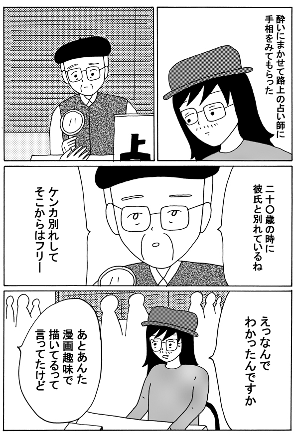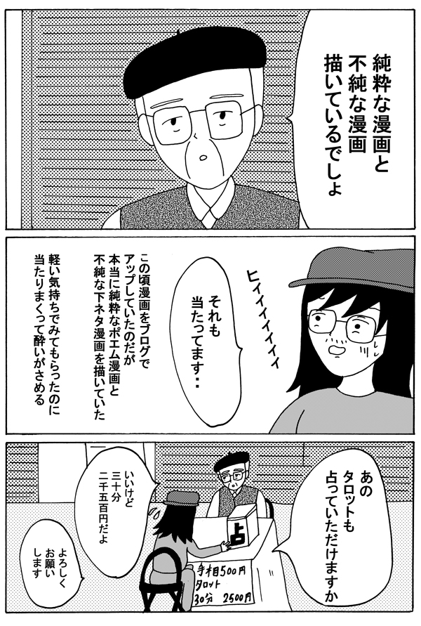 サイゾーウーマンカルチャーマンガ緑丘まこ『30代独女、それでもお酒がやめられない』【23回】路上の占い師は当たるのか カルチャー 【連載】「30代独女、それでもお酒がやめられない」(緑丘まこ) 【マンガ】路上の占い師は信用できるのか――「破滅」と占われたあの日【23回】 2019/02/23 18:00 緑丘まこ マンガ緑丘まこ30代独女、それでもお酒がやめられない 路上の占い師に…… 次のページ 生まれた時からの宿命 前のページ12345次のページ 関連記事 【配信者マンガ】「R18配信」で2度の衝撃!? 臨場感たっぷりの「セックス音」にムラムラしたものの【第20回】【タイ移住マンガ】とりあえず渡航日決めちゃおう! 怒涛の「転職&結婚」プロジェクト【24話】【日雇いマンガ】35話『分かりたい、分からない……! ブルーベリー農園の悲劇』【マンガ・ヤリマン引退】妊婦の性欲、セックス以外でどう発散する? オナニー・AV鑑賞、そして……【第27回】【マンガ】元ヤンの同僚はいい子だった――「固定観念」に囚われた自分に、気づいた話【21話】 その他の作品を読むバックナンバーを読む