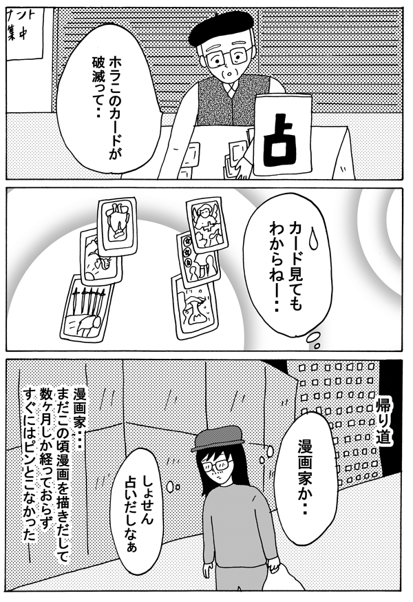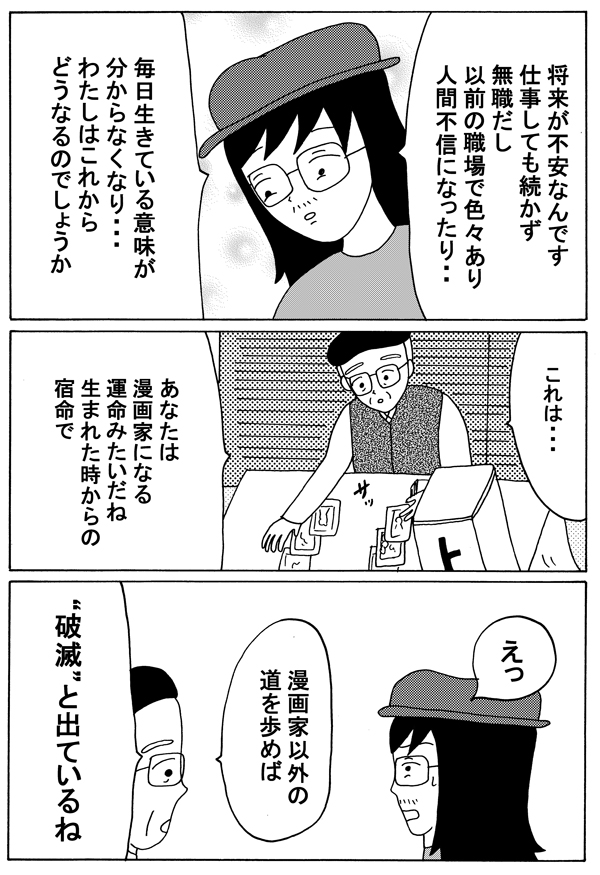 サイゾーウーマンカルチャーマンガ緑丘まこ『30代独女、それでもお酒がやめられない』【23回】路上の占い師は当たるのか カルチャー 【連載】「30代独女、それでもお酒がやめられない」(緑丘まこ) 【マンガ】路上の占い師は信用できるのか――「破滅」と占われたあの日【23回】 2019/02/23 18:00 緑丘まこ マンガ緑丘まこ30代独女、それでもお酒がやめられない 生まれた時からの宿命 次のページ それから数カ月後 前のページ12345次のページ 関連記事 【配信者マンガ】「R18配信」で2度の衝撃!? 臨場感たっぷりの「セックス音」にムラムラしたものの【第20回】【タイ移住マンガ】とりあえず渡航日決めちゃおう! 怒涛の「転職&結婚」プロジェクト【24話】【日雇いマンガ】35話『分かりたい、分からない……! ブルーベリー農園の悲劇』【マンガ・ヤリマン引退】妊婦の性欲、セックス以外でどう発散する? オナニー・AV鑑賞、そして……【第27回】【マンガ】元ヤンの同僚はいい子だった――「固定観念」に囚われた自分に、気づいた話【21話】 その他の作品を読むバックナンバーを読む