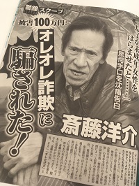サイゾーウーマンコラム神林広恵「女性週刊誌ぶった斬り」中居正広“独立ナシ”の「女性セブン」 コラム “噂の女”神林広恵の女性週刊誌ぶった斬り!【第450回】 中居正広“独立ナシ説”を断言する「女性セブン」と「日刊ゲンダイ」 2019/03/05 21:00 神林広恵 女性週刊誌ぶった斬り! 「週刊女性」3月19日号(主婦と生活社) 下世話、醜聞、スキャンダル――。長く女性の“欲望”に応えてきた女性週刊誌を、伝説のスキャンダル雑誌「噂の真相」の元デスク神林広恵が、ぶった斬る! タレントの有村藍里が美容整形を受けたことを公表し話題に。これまでも何かと妹の有村架純と比較されてきたんだろうな。大きな決断をし、明るい表情の藍里だが、今後の活躍を応援したい。 第450回(2/28〜3/5発売号より) 1位「警鐘スクープ 斎藤洋介 オレオレ詐欺に騙された!『息子が未成年女性をはらませたと……』」(「週刊女性」3月19日号) 2位「中居正広 香取・草なぎ・稲垣も ファン歓喜2・19沖縄の夜」(「女性セブン」3月14日号) 3 位「テレ朝連続女子アナ退社の裏で…有働由美子VS徳永有美で『降板決めた』仰天人事」(「女性セブン」3月14日号) 「週刊女性」のトップ特集。それが俳優・斎藤洋介のオレオレ詐欺被害の告白スクープだ。記事を読むと、改めて高齢者を襲う詐欺の深刻さを感じる。 斎藤の妻の携帯にかかってきた次男を名乗る男からの電話。非通知だったことで不審を抱くも、その直後に新宿遺失物預かりを名乗る人物からの連絡。そして「未成年者を妊娠させた」という次男と、金を受け取るという弁護士の存在――。 巧妙だ。斎藤をターゲットとして、さまざまな情報を事前に収集していたらしい。結果、100万円を騙し取られてしまったという。しかも斎藤は詐欺被害の前に、特殊詐欺を扱ったテレビ番組にも出演していたのに、だ。ターゲットとされてしまうと、いくら知識があっても騙される可能性はある。そんな斎藤の詐欺被害告白だが、ワイドショーもこぞってこれを取り上げた。 確かに、つい最近も江東区の80歳の高齢女性が不審な“アポ電”の後、強盗に入られ殺害されるという事件があり、特殊詐欺が凶悪化していることが大きなニュースになったばかり。このほかにも渋谷でも同様の手口での強盗が起こっているから、大きな関心を集めたのだろう。 だがもうひとつ、驚いたことが。この問題を取り上げたワイドショーで、斎藤が「週女」に被害を告白する様子を動画で流していたことだ。そう、今回、「週刊女性」は斎藤の告白インタビューを録画し「週刊女性PRIME」でネット公開しているのだ。 ここ数年、「文春デジタル」などを中心に、直撃取材の様子など週刊誌の動画活用がさかんになり、それがワイドショーでも二次使用され放映されている。が、しかし「週女」発の動画がワイドショーで流されたのは今回が初めてではないか。 もちろん「週刊女性PRIME」でも動画は配信されているが、しかしそれらは布川敏和の長男が出演予定だった舞台を突如降板したことで父親の布川を直撃した動画だったり、モト冬樹がスズメを違法飼育していたとして直撃したものだったりと、どーうでもいいやつだった。しかし今回は、地上波で放送された! 快挙(笑)! 今後、週刊誌の取材やインタビュー動画撮影は必須になるのかも。活字より動画。なんだか寂しい。 次のページ 「女性セブン」の中居正広ネタ 12次のページ 関連記事 嵐・二宮和也、「伊藤綾子が原因で両親と関係悪化」報道から見える木村拓哉との類似点中居正広、“番組打ち切り宴会”記事と「新番組スタート予定」報道から見る独立の行方globe・KEIKOの“復活”で暴かれる、夫・小室哲哉の嘘SMAPを見てきた嵐が選んだ、“結婚”と「活動休止」の落としどころ嵐の活動休止の裏で、中居正広の“独立”をめぐるマスコミとジャニーズの迷走