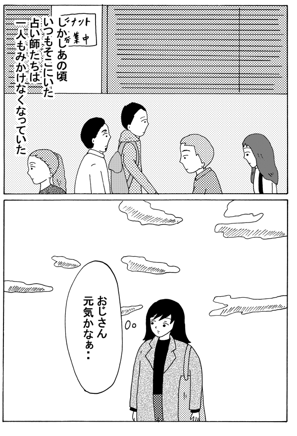 サイゾーウーマンカルチャーマンガ緑丘まこ『30代独女、それでもお酒がやめられない』【24回】元○○の占い師とサシ飲み カルチャー 【連載】「30代独女、それでもお酒がやめられない」(緑丘まこ) 【マンガ】「路上の占い師」は元○○だった――身の上話と、サシ飲みの夜【24回】 2019/03/09 18:00 緑丘まこ 緑丘まこ30代独女、それでもお酒がやめられないマンガ いつものあの場所は ――「30代独女、それでもお酒がやめられない」次回の更新は3月23日(土)になります。お楽しみに! 緑丘まこ(みどりおか・まこ) 兵庫県育ちの30代独女。漫画とゲームとお酒をこよなく愛する。 センベロ居酒屋やレトロなレストランを発掘するのが休日の楽しみ。 お酒は最高の友達。 Twitter note 【バックナンバーはこちらから】 (第1回はこちら:酒飲みの聖地・赤羽に、女ひとりでやってきたのだ) (第2回はこちら:赤羽のユミコさんに見た「酔っぱらいの法則」) (第3回はこちら:渋谷のコインロッカーに挟まれた三十路の夜) (第4回はこちら:安ワインが招いた“三日酔い”と血染めバスタブのゆくえ) (第5回はこちら:新幹線でエンドレス泥酔の旅) (第6回はこちら:手みやげ片手に密着警察24時) (第7回はこちら:”魅惑のタダ酒”で酩酊した結果) (第8回はこちら:目覚めたら美女とキス!?) (第9回はこちら:忘れられない”初体験”) (第10回はこちら:初めての夏、”アイツ”は突然やってきた) (第11回はこちら:親友ケイコが”ヤル気”になった夜) (第12回はこちら:支離滅裂な思考と「逆ナン」の夜) (第13回はこちら:上野でせんべろ昼飲みツアー) (第14回はこちら:泥酔した翌朝に知る「自分」のヤバイ行動) (第15回はこちら:新幹線で朝酒、トロッコ列車で昼酒!) (第16回はこちら:熊と地ビールと尿意) (第17回はこちら:バングラデシュのマイクさん) (第18回はこちら:「使えない」と言われるマイクさん) (第19回はこちら:マイクさんが見せた”凄い特技”) (第20回はこちら:ケイコの泥酔事件簿) (第21回はこちら:続・ケイコの泥酔事件簿) (第22回はこちら:「昼からお酒」は許せない?) (第23回はこちら:路上の占い師は信頼できるのか) 前のページ12345 最終更新:2019/03/09 18:00 本当かどうかは問題じゃないのよ 関連記事 【ジャニーズマンガ】「YOU、NEWS5じゃなくて海老詩―だヨ」【『ヅャニーさん』第75回】【マンガ・ヤリマン引退】娘が突然「ヒワイな呪文」!? 一日悩んだ、その答えは……【第31回】【マンガ・ヤリマン引退】遊ぶときには「アレ」を着けなきゃ! プレイの前のエチケット【第30回】【マンガ】私が給料ドロボー!? 毎日続く暴言……会社のストレスが「体に出た」!【第37回】【マンガ】ネット配信で人生が狂った人の裏側ぶっちゃけていいスか!?【17~20話・まとめ読み】 その他の作品を読むバックナンバーを読む 次の記事 米・授賞式ユニーク写真 >