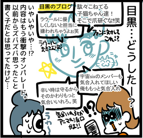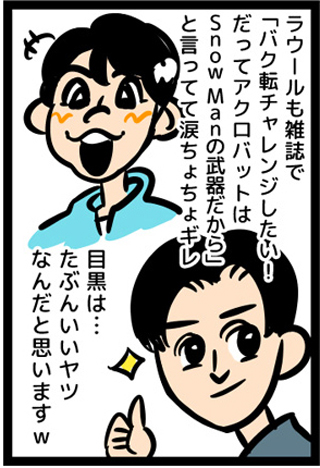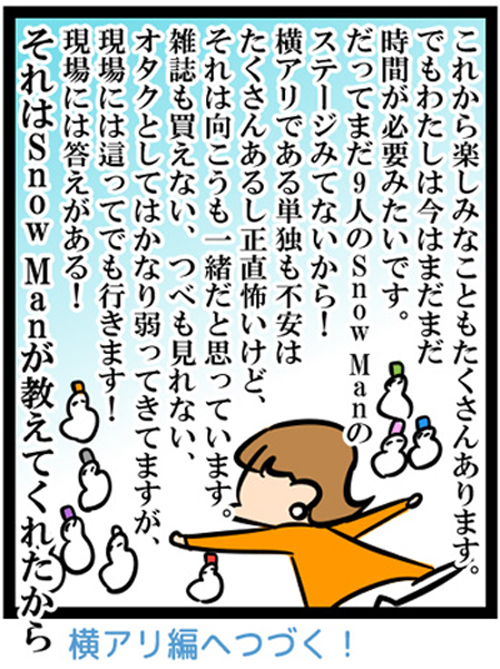 サイゾーウーマンマンガSnow Man増員で見た地獄と希望 男性アイドル えるたまのアイドル自由帳 第61回 【マンガ】タッキーの神の一手か愚策か? ジャニーズJr.・Snow Man増員でファンが見た地獄と希望 2019/03/26 19:32 えるたま ジャニーズえるたまのアイドル自由帳 目黒…いやいやいや! ※マンガは1枚絵でも閲覧できます! →(1)(2)(3) <グループ詳細> Snow Man(スノーマン) 2012年に結成されたジャニーズJr.内ユニット。 当初は深澤辰哉、佐久間大介、渡辺翔太、宮舘涼太、 岩本照、阿部亮平の6人で結成され、その高いパフォーマンス力、 アクロバットの実力は折り紙付き。 これまで滝沢歌舞伎をはじめとした舞台への出演、 さらにタッキー&翼やKis-My- Ft2のバッグなどを務めてきた。今年に入り突如、 関西ジャニーズJr.の向井康二、宇宙Sixの目黒蓮、 15歳の村上真都ラウールの3人が追加メンバーとして加入し、 それまでのファンを震撼させた。 この増員についてメンバーの深澤は、 現在放送中のドキュメンタリー番組「RIDE ON TIME」内で、「 このグループだけはどうしても守りたかったんで」と語り、 Snow Manが岐路に立たされていたことを示唆した。次回、Snow Man横浜アリーナ単独公演を完全レポ! 9人になったスノは果たして新たな魅力を発揮し、 次なるステップを踏み出せるのか!? <お知らせ> 「えるたまのアイドル自由帳」新シリーズ「オタク駆け込み煩悩寺」始動! 人様のオタクっぷりをえるたまさんがマンガにします(不定期)。推しへの愛をマンガにしてほしい方、熱い追っかけエピソードをお持ちの方、もしくは実際にアイドル・アーティストとして活動されてる方(及びマネージャーさん)がいらっしゃいましたら、どしどしえるたまさんのTwitter( https://twitter.com/L_tama)へリプライをください。(採用するか否かは編集部と相談のうえ決定いたしますので、必ずしもマンガになるわけではありません。何卒ご了承ください) えるたま erutama_prof 東京生まれロキノン育ち今はアイドルのATM。マンガ家・イラストルポライター。 ブログ( http://onolcy.blog.fc2.com/ ) ツイッター( https://twitter.com/L_tama ) 前のページ12345 最終更新:2020/02/10 13:46 関連記事 【マンガレポ】オタクの課金は意味ナシ!? 配信投票が謎深い「ジュノン・スーパーボーイ・コンテスト」の光と闇【マンガ】平野紫耀はアイドル最終兵器キメラである――LDH・K-POPオタを唸らせるKing&Prince【アイドル自由帳:59回】スタダ、LDH、K-POPの若手3グループ集結……! 子どもと筋肉とドーランにひれ伏した!K-POPは空前の「日本人アイドル」バブル! NCT、PENTAGONら逆輸入イケメンを青田買い嗚呼12人の美しき少年たちよ…EXOの神々しさに思わず合掌!――SMタウンがやってきた!! その他の作品を読む 次の記事 HISASHI不倫報道「女性自身」の謎の文 >