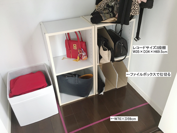 サイゾーウーマン暮らし住まい200円で作る「ブランコハンガー」が便利! 暮らし 収納の悩みをスッキリ解決します! 伊藤まきの「お片付けSOS」相談! 「バッグ収納」のイライラがスッキリ解決! 200円で狭小クローゼットの容量“2倍増”の方法 2019/04/01 19:30 伊藤まき 「お片付け・お掃除SOS」伊藤まき 200円で出来る「ブランコハンガー」で、収納力2倍アップ! 【伊藤まきの回答】 目的のアイテムを、1発で出し入れできるのが「吊り下げ」の魅力! 「クローゼット内のバッグ収納」についてのお悩みを、大田区在住のE・Hさんから受け取りました。Hさん的には、モノの回転率が高めなので断捨離の必要はないとのことです。写真からも、モノを溜め込みタイプではないし、ワンアクションで出し入れする収納法が好みだとわかります。 解決案の前に、一般的な「クローゼット内のバッグ収納」について解説しておきます! バッグ収納は、その数・場所・好みなどによって収納法が変わります。大きく分けると、次の4パターンです。 あなたのベストチョイスは? 快適な「バッグ収納」4パターン! 女性のクローゼットは、本人の好み、スタイル、バッグの数、収納庫の種類などによって条件が異なります。そのいくつかを組み合わせて、主に4パターンから選びます。 [1] 置き形式「オープンラック」 Hさん宅クローゼットサイズのイメージを再現 クローゼットの中に、スチールラックやカラーボックスを設置する方法です。ハンドバッグやクラッチなど、型がしっかりしたバッグに適しています。また、ファイルボックスなどで仕切りを入れると更に使いやすく“バッグ迷子”になりません。奥行きをフル活用したいなら、キャスター付きのスチールラックが最適です。 [2]積み重ね式「ボックス・イン」 天袋の高さが50cmある例になります ヘビロテするバッグを除く、ストック収納に限ります。使用頻度の低いバッグを、フタ付きやファスナー付きの布製ボックスに入れて積み重ねる方法です。また、天袋付きのクローゼットならフタ無しのボックスでOK。中に何が入っているのか、写真と番号で記録するのもオススメです。 次のページ [3] 引き出し式「チェスト・イン」 前のページ1234次のページ 関連記事 セリアの100円グッズで、ランドリーラックのイライラ「隙間」を快適収納にアップ!100均のアレを使って“掃除嫌い”を克服! 片付かない家の「ダメ共通点」をズバリ解決奥行き納戸には「ダイソー」と「カラボ」! “区切って重ねて” 片付け無法地帯がスッキリ!タオル収納は「ダイソーのフラップ式ボックス」が正解! 狭い洗面所も清潔&極楽のコツ1,280円でイライラ解消! 扉式キッチンの使いづらい“シンク下収納”を制するコツ
