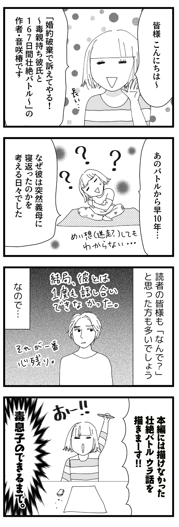 サイゾーウーマンカルチャーマンガ音咲椿『婚約破棄で訴えてやる!~毒親持ち彼氏と167日間壮絶バトル~』【新連載】毒親支配マンガ・1話 カルチャー 【マンガ】私の彼が毒親から逃れられない!~婚約破棄で訴えてやる・番外編~ 【マンガ】私の彼が毒親から逃れられない!~婚約破棄で訴えてやる・番外編~【新連載】 2019/04/01 13:00 音咲椿 マンガ音咲椿婚約破棄で訴えてやる! 「君ってなんだか、僕の母に似てるんだよね」――。 今年2月に完結した、音咲椿先生の実録コミックエッセイ 『婚約破棄で訴えてやる!~毒親持ち彼氏と167日間壮絶バトル~』。 婚約していた彼は、なぜ突然手のひらを返したのか? あんなに嫌悪していたはずの“毒母”側についたのはどうして? 交際していた当時の記憶から、 あの頃の彼の心理と背景を掘り下げる、前日譚コミックエッセイ。 あれから10年、残る疑問 ※前作はこちら 次のページ 彼の幼少期は… 12次のページ 関連記事 【マンガ】婦人科の悩みは人それぞれ! 度肝を抜かれた「お会計」【第49回】【配信者マンガ】70万円を荒稼ぎ!? 「アダルト配信サイト」に挑戦してみたら【第24回】【マンガ】婚約破棄で訴えてやる!~毒親持ち彼氏と167日間壮絶バトル~【1~3話+告知】【マンガ・ヤリマン引退】何度言ってもダメなのに……!? 「母よりネコ」の優先順位【第36回】【マンガ・ヤリマン引退】母、娘、そしてネコ! 家庭を見守るふじおの挙動【第35回】 その他の作品を読むバックナンバーを読む