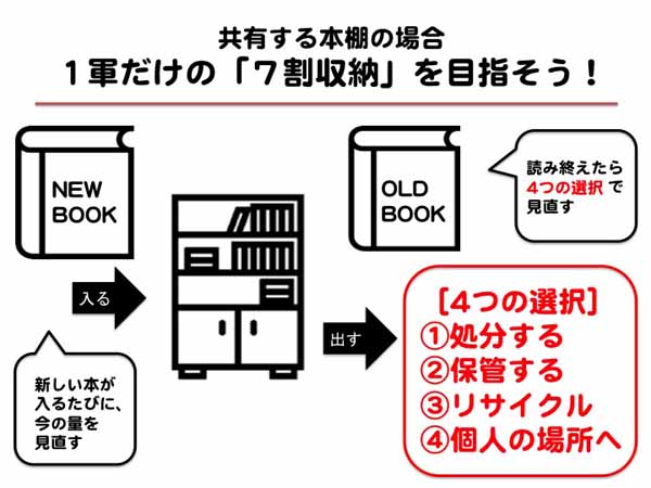 サイゾーウーマン暮らし住まいサイ女編集部の無法地帯が、劇的スッキリ 暮らし [連載]収納の悩みをスッキリ解決します! 伊藤まきの「お片付けSOS」相談! 【断捨離ビフォー&アフター】サイゾーウーマンの「無法地帯」が劇的スッキリ! 大量の本を片付けるコツ 2019/05/13 20:30 伊藤まき 「お片付け・お掃除SOS」伊藤まき 家庭も同じ! 共有の本棚は「7割」と「見直し」が必須! 本棚は、「詰め放題の空間」ではありません。限られたスペースだからこそ、余裕を持った「7割収納」と「定期的な見直し」が必須です。 サイゾーウーマン編集部の場合、本棚はオフィス内の一角にあります。家庭に置き換えれば、リビングにある本棚と同じです。つまり、押入れ以上に活躍するモノが置かれるべき「1軍スポット」と考えます。 まずは、本棚の基本的なルールです。編集部のように限られた共有スペースは、鮮度が命です。つまり、新しい本が増えるたび、古い本を見直して更新する必要があります。本棚から省く本(書類)は、[4つの選択]を基準に見直しましょう。 [1] 処分(資源ごみ)する (読み終えた古い本なら、使い切ったモノとなります) [2] 保管(DATA化)する (趣味や思い出の本など、すぐに読まない本は押入れなどに保管する) [3] リサイクル (鮮度が早いうちに転売するほど、売値が高くなります) [4] 個人の場所へ (溢れた私物は、個人の部屋・自宅へ持ち帰ること) 次のページ 片付けに迷ったら、「こうなった結果」や「悩み」を洗い出す! 前のページ12345次のページ 関連記事 ダイソーと空き箱でズバリ解決! サイゾーウーマンの汚デスク片付け実践【ビフォー&アフター】「ダイソー」のアレでパソコン快適化! サイゾーウーマン編集部の“汚デスク”片付け実践100均のアレを使って“掃除嫌い”を克服! 片付かない家の「ダメ共通点」をズバリ解決「食器棚」の収納力アップに“アレ”は厳禁!! 劇的チェンジの秘訣で「容量300%増」も!?ダイソーの「落ちない名品」で、イラッとするトイレの“収納と掃除”が極楽に!