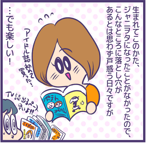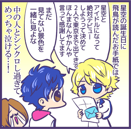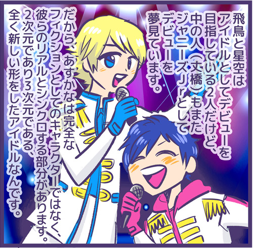 サイゾーウーマンマンガ“あすかな”でジャニオタになった元Kオタ女性 男性アイドル えるたまのアイドル自由帳 第63回 【マンガ】ジャニーズ、バーチャル進出で大ヒット!? “あすかな”にハマったド新規が見た「正しさ」 2019/06/03 21:30 えるたま ジャニーズえるたまのアイドル自由帳 生まれてこの方、ジャニオタになったことがないもので…… <プロジェクト詳細> バーチャルジャニーズプロジェクト 2019年2月からジャニーズがSHOWROOMと共同で始めた 、バーチャルアイドルの動画配信「 バーチャルジャニーズプロジェクト」。海堂飛鳥( かいどうあすか)と苺谷星空(いちごやかなた) というアイドルを目指す高校生のキャラクターを、 ジャニーズJr.ユニット「なにわ男子」 の藤原丈一郎が海堂、大橋和也が苺谷を担当し、ほぼ毎日、 生配信を行っている。プロジェクト発表当初は、 長らくインターネットと断絶されていたジャニヲタからは懐疑的な 声も上がったが、フタを開けてみればアニメヲタやK- POPヲタなど、 非ジャニヲタからの大量新規流入に成功する結果に。 毎日の生放送で事故一つ起こさず、 ファンを増やし続けている裏には、Jr. 歴苦節15年半の藤原丈一郎と、 天真爛漫な大橋和也が持つ人間性の高さが成功の鍵になっているの かもしれない。このプロジェクトが今後どう転がっていくのか、 注視していきたい。 <お知らせ> 「えるたまのアイドル自由帳」新シリーズ「オタク駆け込み煩悩寺」始動! 人様のオタクっぷりをえるたまさんがマンガにします(不定期)。推しへの愛をマンガにしてほしい方、熱い追っかけエピソードをお持ちの方、もしくは実際にアイドル・アーティストとして活動されてる方(及びマネージャーさん)がいらっしゃいましたら、どしどしえるたまさんのTwitter( https://twitter.com/L_tama)へリプライをください。(採用するか否かは編集部と相談のうえ決定いたしますので、必ずしもマンガになるわけではありません。何卒ご了承ください) えるたま 東京生まれロキノン育ち今はアイドルのATM。マンガ家・イラストルポライター。 ブログ( http://onolcy.blog.fc2.com/ ) ツイッター( https://twitter.com/L_tama ) 前のページ123 最終更新:2020/02/10 13:48 日本語が不自由なところがKドル感あるのか? 関連記事 【マンガ】ジャニーズJr.・Snow Man増員後、単独初公演――ファンが見たのは希望か“慣れ”か!?【マンガ】タッキーの神の一手か愚策か? ジャニーズJr.・Snow Man増員でファンが見た地獄と希望【マンガレポ】オタクの課金は意味ナシ!? 配信投票が謎深い「ジュノン・スーパーボーイ・コンテスト」の光と闇【マンガ】平野紫耀はアイドル最終兵器キメラである――LDH・K-POPオタを唸らせるKing&Prince【アイドル自由帳:59回】スタダ、LDH、K-POPの若手3グループ集結……! 子どもと筋肉とドーランにひれ伏した! その他の作品を読む 次の記事 元Jr.高橋颯がホリプロ移籍 >