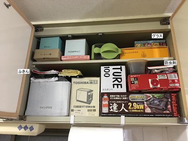 サイゾーウーマン暮らし100均・雑貨キッチンが臭くなるNG収納 暮らし 30代女子の「煩悩部屋」ビフォーアフター 買ってはいけない! やってはいけない! キッチンが臭くなるNG収納と対策法5つ 2019/06/17 19:30 伊藤まき 伊藤まき「汚部屋」ビフォーアフター 詰め込んだら危険、モノが降ってくる上戸棚収納!? [Before]ギフトで増えがちな、グラス類のストック! 以前の、シンク上の上戸棚(シンク側)です。滅多に使わないモノと、隙間に詰め込んだラップ類があります。中には、存在さえ忘れていたモノもありました。すべてのモノを取り出すとき、奥のモノが落下してくる危険ゾーンでした。 [After]箱の表面に「ラベル」を貼って、一目瞭然に! 使用頻度の低い、ワイングラス、おちょこ、季節のモノ(ガスコンロ、お茶ボトル)、調理家電(トースター、たこ焼き器)などを「見える化」収納に改善。箱を重ねる時は、重たいモノを下にして2つまでとします。軽めのモノなら、3段目に置いても可です。これで、落下の危険も防止できました。 次のページ 上戸棚の下段は、よく使う軽めのモノを置くと便利! 前のページ123456次のページ 関連記事 ダイソー、ニトリを活用! スペースがなくても大丈夫、「トイレ収納」を極める5つのコツセリアの100円グッズで、ランドリーラックのイライラ「隙間」を快適収納にアップ!【セリアずぼらシュラン】「無印」類似品が100円! 「ステンレススポンジトング」★5つ“汚キッチン”を片付ける5つのポイント! 皿、保存容器や鍋の「要不要」はコレで見極めるやってはいけない「オシャレ収納」! キッチンが“黒カビ”パラダイスになるNG例
