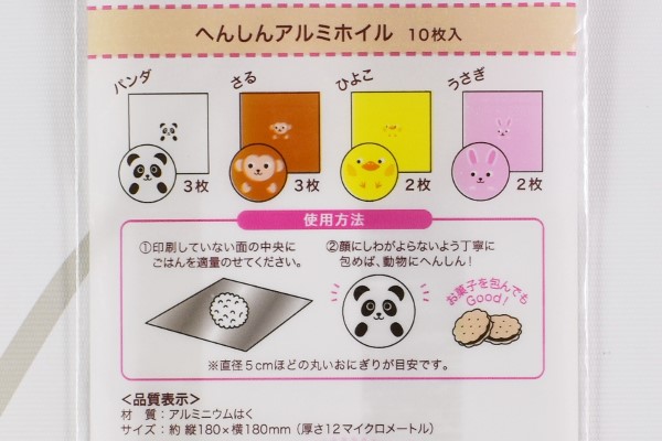 サイゾーウーマン暮らし100均・雑貨セリア、おにぎりが動物に変身 暮らし 【100均ずぼらシュラン】 【100均ずぼらシュラン】おにぎりが動物に! セリア「へんしんアルミホイル」で弁当は華やぐか? 2019/07/09 13:30 ずぼら均子 100均セリア100均ずぼらシュラン 安くてお得に日用品を買いに行ったつもりが、あれもこれもとカゴに入れてしまう100均ショップ。「超便利!」とほくそ笑むグッズもあれば、「買わなきゃよかった……」なトホホなグッズも潜む、魑魅魍魎な100均ワールドをズボラなアラサー女子がご案内! 私見全開でアイテムを斬る「セリアずぼらシュラン」開店です★ 今日のセリアアイテム【へんしんアルミホイル 10枚入】 便利度:★★★☆☆(通常のアルミと変わりません) コスパ:★★★☆☆(10枚入りで100円だから普通かな……) かわいさ:★★★★★(ずんぐりした動物たちが超かわいい!) 最近職場におにぎりを持っていくのですが、包んでいるアルミホイルの見た目が無機質なんですよね……。変なところに凝り性なので、お弁当は見た目にもこだわりたい! そこで今回は、セリアで見つけてきた「へんしんアルミホイル 10枚入」をピックアップ。おにぎりを包むと動物に変身する、アルミニウム箔のアルミホイルです。おにぎりを用意して、早速包んでいきましょう! 動物のラインナップは4種類。「パンダ」「さる」「ひよこ」「うさぎ」から選べます。どの動物もかわいいので、とっても悩みましたが、今回はパンダでおにぎりを包むことに。 次のページ ずんぐり体型のパンダちゃんが登場! 12次のページ 関連記事 【セリアずぼらシュラン】冷蔵庫のスペース有効活用、「フック付きチューブクリップ」が画期的!?【セリアずぼらシュラン】ティシュが出てこない! 買って失敗した「ティッシュケース」【セリアずぼらシュラン】「S字回転フック大」収納ツールとして用途不明、耐荷重も中途半端!【セリアずぼらシュラン】「無印」類似品が100円! 「ステンレススポンジトング」★5つセリアの100円グッズで、ランドリーラックのイライラ「隙間」を快適収納にアップ!