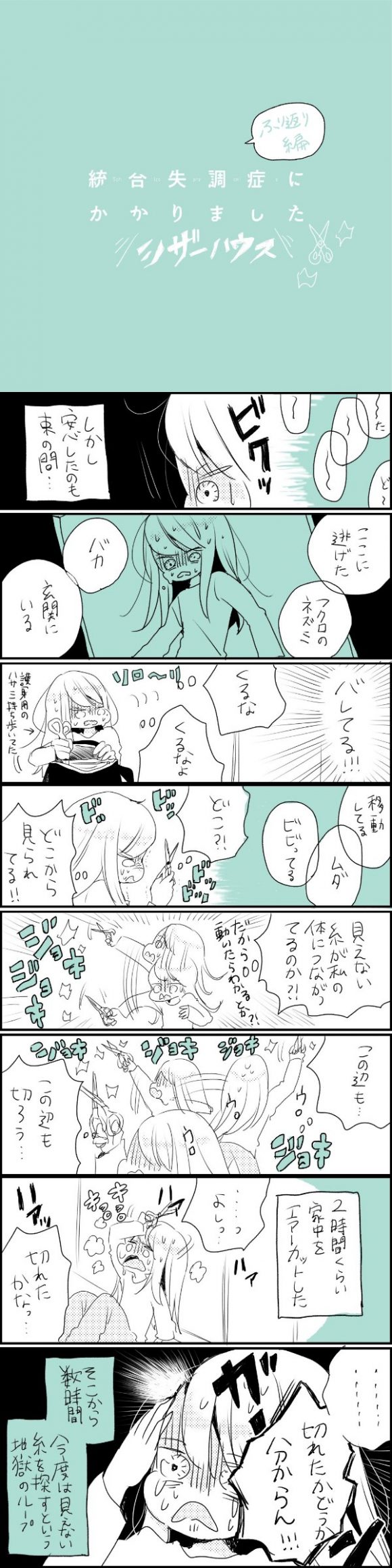 サイゾーウーマンカルチャーマンガ【マンガ】体力だけ消耗する恐怖 カルチャー 【エッセイマンガ】さいこ『統合失調症にかかりました』 【エッセイマンガ】統合失調症にかかりました〜ふり返りエピソード・後編〜 2019/08/14 17:00 さいこ マンガさいこ統合失調症にかかりました 自身の闘病経験を漫画にした『統合失調症にかかりました』がインスタグラムで話題のさいこ。2018年3月のアカウント開設以来、増え続けたフォロワーは3万人を越え、その反響の大きさを物語っています。 現在、サイゾーウーマンにて猫目線での統合失調症を描いた『統合失調症〜にゃんside〜』を連載中ですが、今回、番外編として、インスタグラム上で注目を集めた前作『統合失調症にかかりました』の振り返りエピソードを2週にわたって特別掲載。 ふり返りエピソード・後編 〜シザーハウス〜 ©さいこ ー統合失調症にかかりました〜にゃんside〜』最新話は8月21日(水)更新予定です。 【『統合失調症にかかりました』はこちらから】 自己紹介編 まとめ前編1~9話/まとめ後編10~18話 19話/20話/21話/22話/23話/24話/25話/26話/27話/28話/29話/30話/31話/32話/最終話 ※本作品は個人の経験に基づいたものです。統合失調症の症状もあくまでもその一部であり、絶対ではありません。個人差がありますことをご理解ください。 さいこ/@s_______ic インスタグラムにて、統合失調症にかかった自身の体験マンガを日々投稿。 https://www.instagram.com/s_______ic/ 最終更新:2019/08/14 17:00 家の中すら安心できない 関連記事 【エッセイマンガ】統合失調症にかかりました~にゃんside〜【9話・ショクジ】【エッセイマンガ】統合失調症にかかりました~にゃんside〜【8話・ショウスイ】【エッセイマンガ】統合失調症にかかりました~にゃんside〜【7話・イジョウ】【エッセイマンガ】統合失調症にかかりました~にゃんside〜【6話・フミンフキュウ】【エッセイマンガ】統合失調症にかかりました~にゃんside〜【5話・ザイタク】 その他の作品を読む 次の記事 マツコ、N国「無視」の意向? >