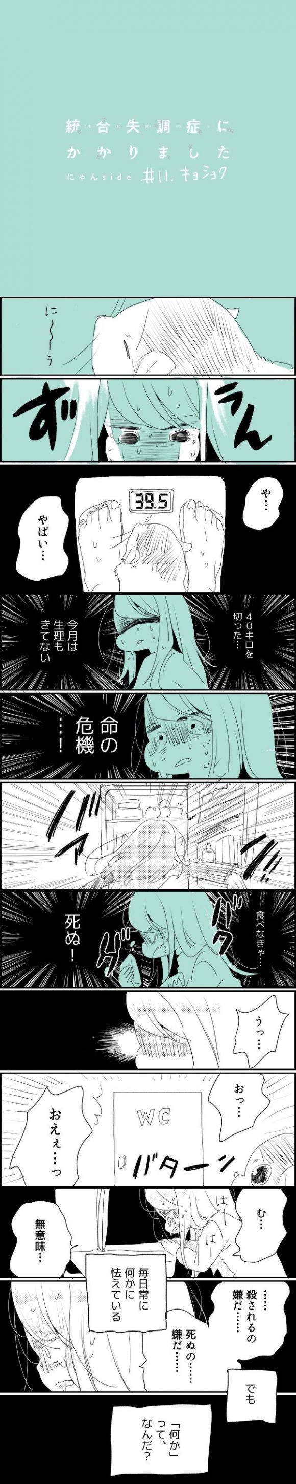 サイゾーウーマンカルチャーマンガさいこ『統合失調症にかかりました~にゃんside〜』【11話】体重が40キロを切った日 カルチャー 【エッセイマンガ】さいこ『統合失調症にかかりました〜ニャンサイド〜』 【エッセイマンガ】統合失調症にかかりました~にゃんside〜【11話・キョショク】 2019/08/28 17:00 さいこ マンガさいこ統合失調症にかかりました〜にゃんside〜 サイゾーウーマンにて連載していた、自身の統合失調症の発症から社会復帰までを描いた闘病エッセイマンガ『統合失調症にかかりました』(著:さいこ)。今回、飼い猫の視点から病気を振り返る特別編がスタート。 猫から見た、人間の“生き辛さ”とは……。 【過去話はこちらから】 第11話『キョショク』 ©さいこ ー次回12話は9月4日(水)更新予定です。 【前作『統合失調症にかかりました』はこちらから】 自己紹介編 まとめ前編1~9話/まとめ後編10~18話 19話/20話/21話/22話/23話/24話/25話/26話/27話/28話/29話/30話/31話/32話/最終話 ※本作品は個人の経験に基づいたものです。統合失調症の症状もあくまでもその一部であり、絶対ではありません。個人差がありますことをご理解ください。 さいこ/@s_______ic インスタグラムにて、統合失調症にかかった自身の体験マンガを日々投稿。 https://www.instagram.com/s_______ic/ 最終更新:2019/09/02 20:32 食が苦しみに 関連記事 【エッセイマンガ】統合失調症にかかりました~ニャンサイド〜【新連載】【エッセイマンガ】統合失調症にかかりました~ニャンサイド〜【2話・マエブレ】【エッセイマンガ】統合失調症にかかりました~にゃんside〜【3話・コメソウドウ】【エッセイマンガ】統合失調症にかかりました~にゃんside〜【4話・フテキゴウ】【エッセイマンガ】統合失調症にかかりました~にゃんside〜【5話・ザイタク】 その他の作品を読む 次の記事 フジ・伊藤利尋アナ、“失言”で炎上 >