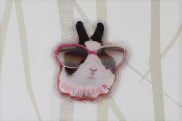同商品のサイズは、縦約12cm×横10cmとコンパクト。ウサギの形にカットされており、“ニョキッ”と2つの耳が飛び出した斬新なデザインです。しかもこのウサギさん、サングラスまでかけてる! ヒクヒクと動き出しそうな可愛いお鼻に、ちょい悪サングラスをかけた姿がギャップ萌えを誘います。