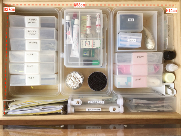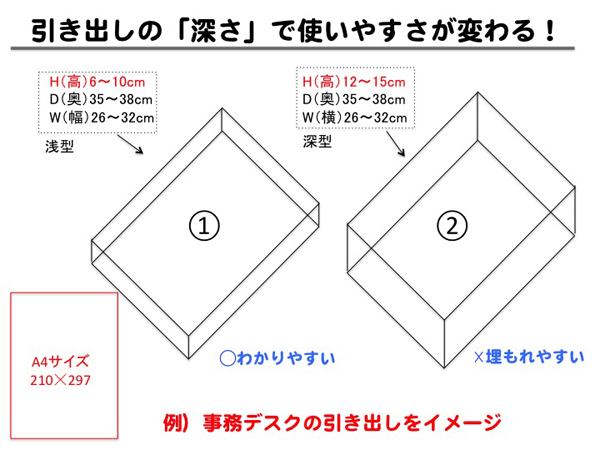 サイゾーウーマン暮らし住まい100均で「深型引き出し」整理を攻略! 暮らし 伊藤まきの「お片付けSOS」相談! 100均グッズで「深型引き出し」収納を極める! 書類・小物・薬のゴチャつき整理術 2019/09/23 19:30 伊藤まき 「お片付け・お掃除SOS」伊藤まき 100均の透明箱で「見える化」すれば迷わない! 【伊藤まきの回答】 引き出し内の「小物収納」は、目的のモノを一発で手にとれれば完璧です。家族からの、「ママ、あれドコ〜?」にいちいち答える必要もありません。例えば、下の写真は筆者宅のテレビボードの引き出しです。Aさん宅と同じ深さ14cmの「深型」ですが、モノが埋もれないように「タテ入れ収納」をしているので、モノの存在がひと目でわかります。 [筆者宅例]透明の箱やケースで「タテ入れ」分類 ポイントは、透明の箱や袋に入れること。よく使うモノ、使わないモノが目立つ機能的な収納になるので、不用品も溜まりません。しかも用意するのはすべて、100均なので簡単! ちなみに、「タテ入れ」収納に使っている透明のボックスは、100均の「はがき整理ケース」です。 深型の「引き出し収納」に透明の箱が良い理由を前に、引き出しの「深さ」について説明します。 引き出しの「深さ」で使いやすさが変わる! 例えば、事務デスクの引き出しをイメージしましょう。 一番上の「浅型」には、文房具・印鑑・電卓・領収書など頻繁に使用する小物を収めます。2段目の「深型」には、デジタル小物や私物を収めるケースが多いでしょう。図の浅型[1]は、コスメやカトラリーにも最適です。対して、深型[2]は、小物や書類だと埋もれる欠点があります。でも、モノが埋もれなければ大丈夫! そのコツを説明します。 Aさん宅の引き出しは、「深型」なので透明の箱を使ってひと目で「見える化」できる収納へ変えましょう。また、引き出し1個につき同じ目的を持ったグループ小物をまとめるのもポイントです。ワングループ・ワンボックスで「仕切る」ほど、簡単になります。 次のページ 書類を「重ね置き」するなら100均のA4書類ケース! 前のページ123456次のページ 関連記事 お風呂場“スッキリ”の収納テク! 100均の「吊るす」グッズ、ニトリのマグネットで快適化「無印良品」のファイルが正解! 調味料・食品の“ムダなし”簡単収納テクニックタオル収納は「ダイソーのフラップ式ボックス」が正解! 狭い洗面所も清潔&極楽のコツ「押入れ収納ケース」は買ってはいけない!? 使いやすくて湿気も溜まらない「○○用」が正解!押入れクローゼットを制する整理術! 毎朝、着る服に悩まないワードローブ「33着」の掟