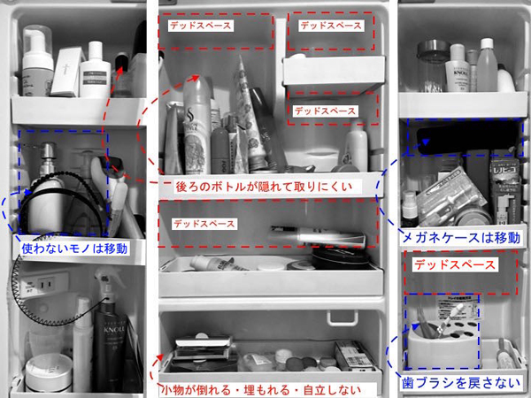サイゾーウーマン暮らし住まい100均「冷蔵庫ミニポケット」が“洗面台”で超活躍! 朝の身支度の「イラッ!」を解決 暮らし 伊藤まきの「お片付けSOS」相談! 100均「冷蔵庫ミニポケット」が“洗面台”で超活躍! 朝の身支度の「イラッ!」を解決 2019/09/30 19:30 伊藤まき 「お片付け・お掃除SOS」伊藤まき 100均の透明アクリルケースで、空間をフル活用! [サンプル]筆者愛用の「鏡裏収納」グッズ例 【伊藤まきの回答】 冷蔵庫の調味料収納に使う「冷蔵庫ミニポケット」「Wクリップ」「粘着フック」「アクリルケース」などを使って“収納力アップ”を狙います。改善ポイントは、この3点。 [1]段差を作ること [2]倒れない「自立収納」を作ること [3]洗面鏡の「扉裏」を活用すること 問題点はどこ? 使っていないモノ、戻さないモノは? まずは、問題点を検証してみましょう。 隙間や空間のデッドスペースが多い Aさん宅は、既成品の洗面化粧台(三面鏡)によくみる、プラスチック製のポケット収納ケースが付属されています。小物が落下しない凹型デザインのため、小物が埋もれます。ほか、毎日使う歯ブラシは【扉を開ける→出す→水を切る→元に戻す】と4アクションになるので、置き場所を変えたほうが効率的かもしれません。青線で囲んだ、ソープボトルやメガネケースもココに置く必要がないと感じました。 次に、3つの改善ポイントを説明していきます。 次のページ 【1】100均のアクリルケースで「段差」を作る! 前のページ1234次のページ 関連記事 100均グッズで「深型引き出し」収納を極める! 書類・小物・薬のゴチャつき整理術お風呂場“スッキリ”の収納テク! 100均の「吊るす」グッズ、ニトリのマグネットで快適化「室内干し」を制するなら「天井吊るし」がベスト!? 持ち家/賃貸で変わる洗濯物干しのコツ使いにくい「洗濯機まわり」がスッキリ! 収納力アップには「○○の延長」とキャスター付きのアレ「無印良品」のファイルが正解! 調味料・食品の“ムダなし”簡単収納テクニック
