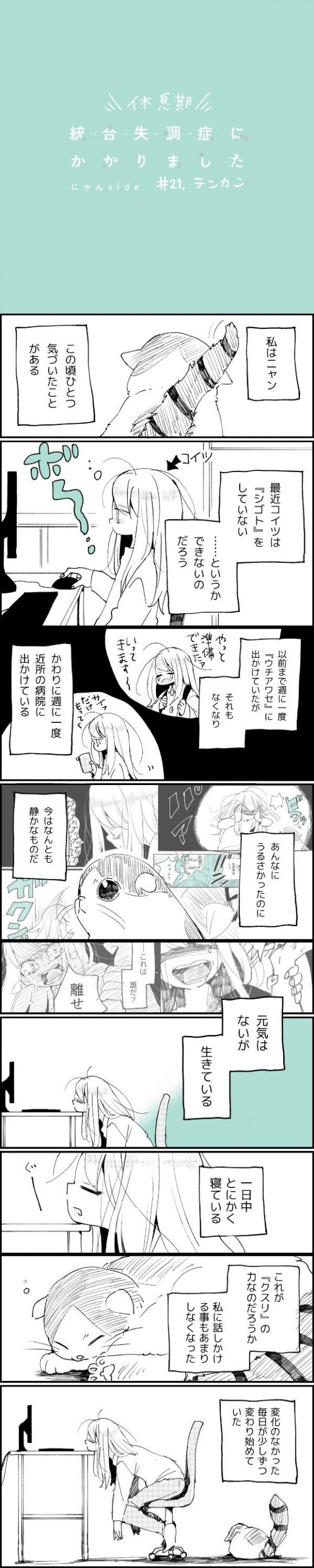 サイゾーウーマンカルチャーマンガさいこ『統合失調症にかかりました~にゃんside〜』【21話】統合失調症の休息期 カルチャー 【エッセイマンガ】さいこ『統合失調症にかかりました〜ニャンサイド〜』 【エッセイマンガ】統合失調症にかかりました~にゃんside〜【21話・テンカン】 2019/11/20 17:00 さいこ マンガさいこ統合失調症にかかりました〜にゃんside〜動物 サイゾーウーマンにて連載していた、自身の統合失調症の発症から社会復帰までを描いた闘病エッセイマンガ『統合失調症にかかりました』(著:さいこ)。今回、飼い猫の視点から病気を振り返る特別編がスタート。 猫から見た、人間の“生き辛さ”とは……。 【過去話はこちらから】 第21話 休息期編『テンカン』 ©さいこ ー次回22話は11月27日(水)更新予定です。 【前作『統合失調症にかかりました』はこちらから】 自己紹介編 まとめ前編1~9話/まとめ後編10~18話 19話/20話/21話/22話/23話/24話/25話/26話/27話/28話/29話/30話/31話/32話/最終話 ※本作品は個人の経験に基づいたものです。統合失調症の症状もあくまでもその一部であり、絶対ではありません。個人差がありますことをご理解ください。 さいこ/@s_______ic インスタグラムにて、統合失調症にかかった自身の体験マンガを日々投稿。 https://www.instagram.com/s_______ic/ 最終更新:2019/11/20 17:00 休むに覚悟大事 関連記事 【エッセイマンガ】統合失調症にかかりました~ニャンサイド〜【新連載】【エッセイマンガ】統合失調症にかかりました~ニャンサイド〜【2話・マエブレ】【エッセイマンガ】統合失調症にかかりました~にゃんside〜【3話・コメソウドウ】【エッセイマンガ】統合失調症にかかりました~にゃんside〜【4話・フテキゴウ】【エッセイマンガ】統合失調症にかかりました~にゃんside〜【5話・ザイタク】 その他の作品を読む 次の記事 NEWS、“キンブレ”の使用に苦言 >