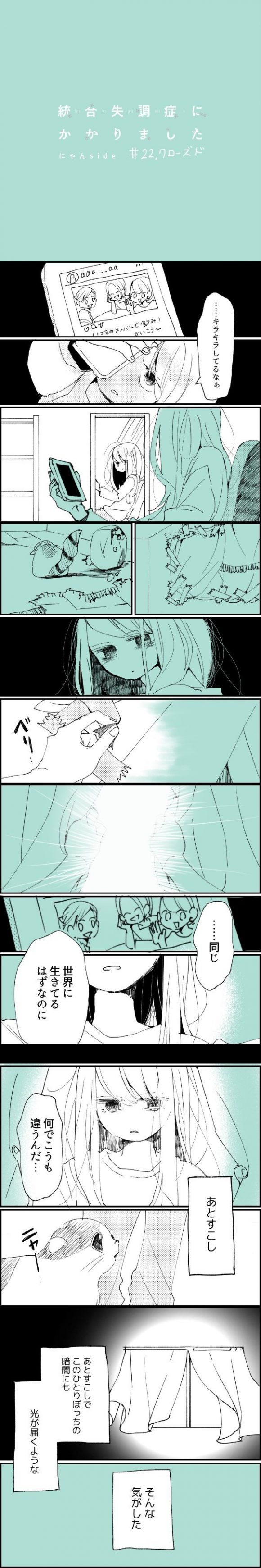 サイゾーウーマンカルチャーマンガさいこ『統合失調症にかかりました~にゃんside〜』【22話】リア充とかけ離れた私 カルチャー 【エッセイマンガ】さいこ『統合失調症にかかりました〜ニャンサイド〜』 【エッセイマンガ】統合失調症にかかりました~にゃんside〜【22話・クローズド】 2019/11/27 17:00 さいこ マンガさいこ統合失調症にかかりました〜にゃんside〜動物 サイゾーウーマンにて連載していた、自身の統合失調症の発症から社会復帰までを描いた闘病エッセイマンガ『統合失調症にかかりました』(著:さいこ)。今回、飼い猫の視点から病気を振り返る特別編がスタート。 猫から見た、人間の“生き辛さ”とは……。 【過去話はこちらから】 第22話 『クローズド』 ©さいこ ー次回23話は12月4日(水)更新予定です。 【前作『統合失調症にかかりました』はこちらから】 自己紹介編 まとめ前編1~9話/まとめ後編10~18話 19話/20話/21話/22話/23話/24話/25話/26話/27話/28話/29話/30話/31話/32話/最終話 ※本作品は個人の経験に基づいたものです。統合失調症の症状もあくまでもその一部であり、絶対ではありません。個人差がありますことをご理解ください。 さいこ/@s_______ic インスタグラムにて、統合失調症にかかった自身の体験マンガを日々投稿。 https://www.instagram.com/s_______ic/ 最終更新:2019/11/27 17:00 比べたらキリがない 関連記事 【エッセイマンガ】統合失調症にかかりました~ニャンサイド〜【新連載】【エッセイマンガ】統合失調症にかかりました~ニャンサイド〜【2話・マエブレ】【エッセイマンガ】統合失調症にかかりました~にゃんside〜【3話・コメソウドウ】【エッセイマンガ】統合失調症にかかりました~にゃんside〜【4話・フテキゴウ】【エッセイマンガ】統合失調症にかかりました~にゃんside〜【5話・ザイタク】 その他の作品を読む 次の記事 武井壮、「勘違いおじさん」と批判噴出 >
